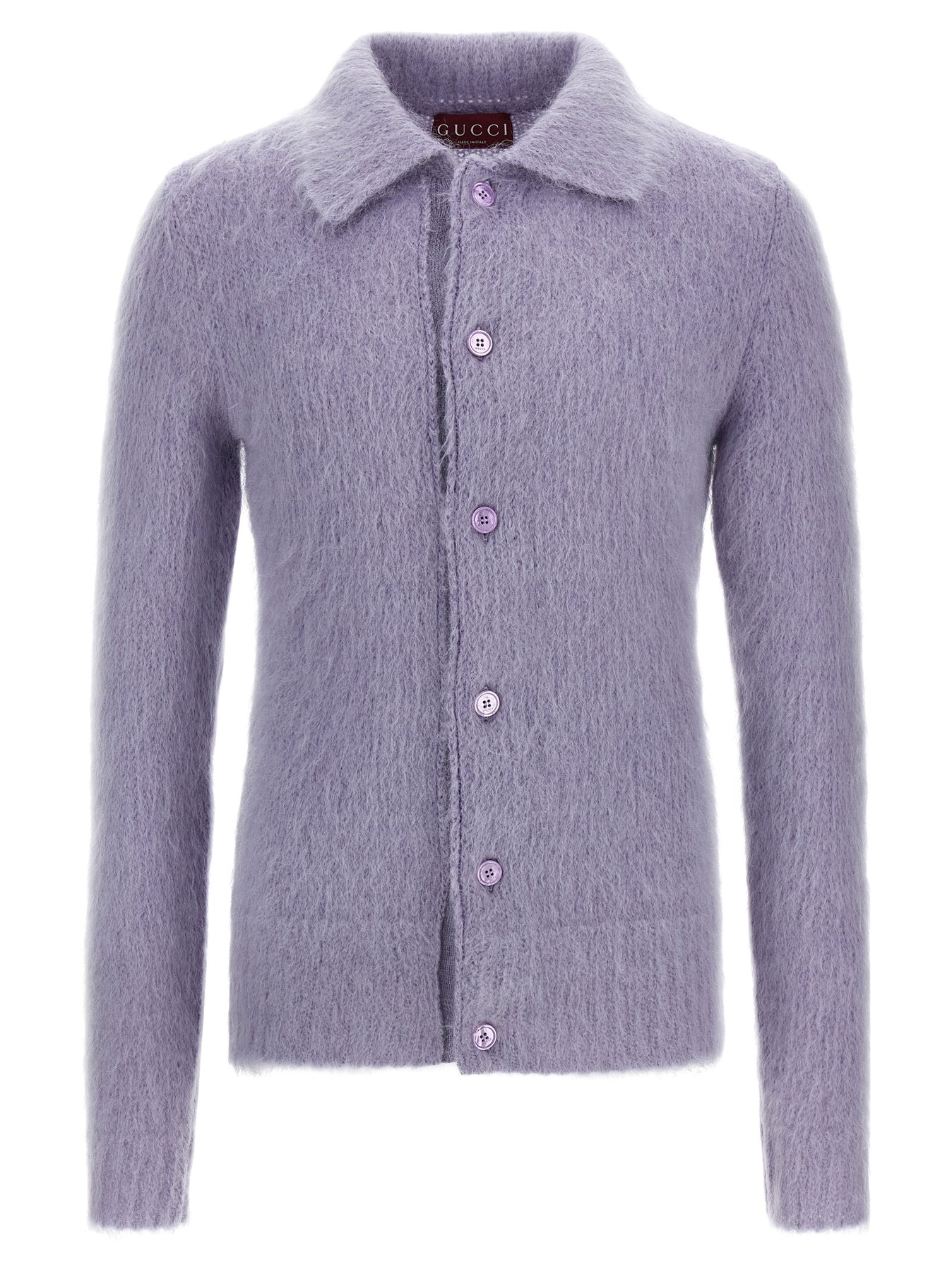 Cardigan in brushed mohair blend wool, 'Polo' model with collar, front button closure, long sleeves with ribbed cuffs.