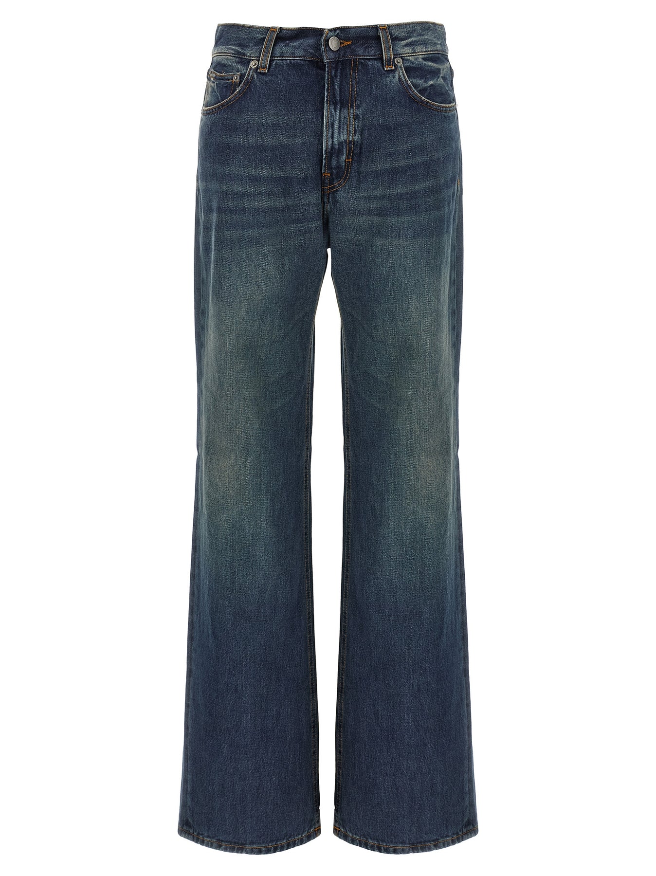 'Korea Intense Blue' cotton denim jeans with zip and button closure, five pockets, straight leg.