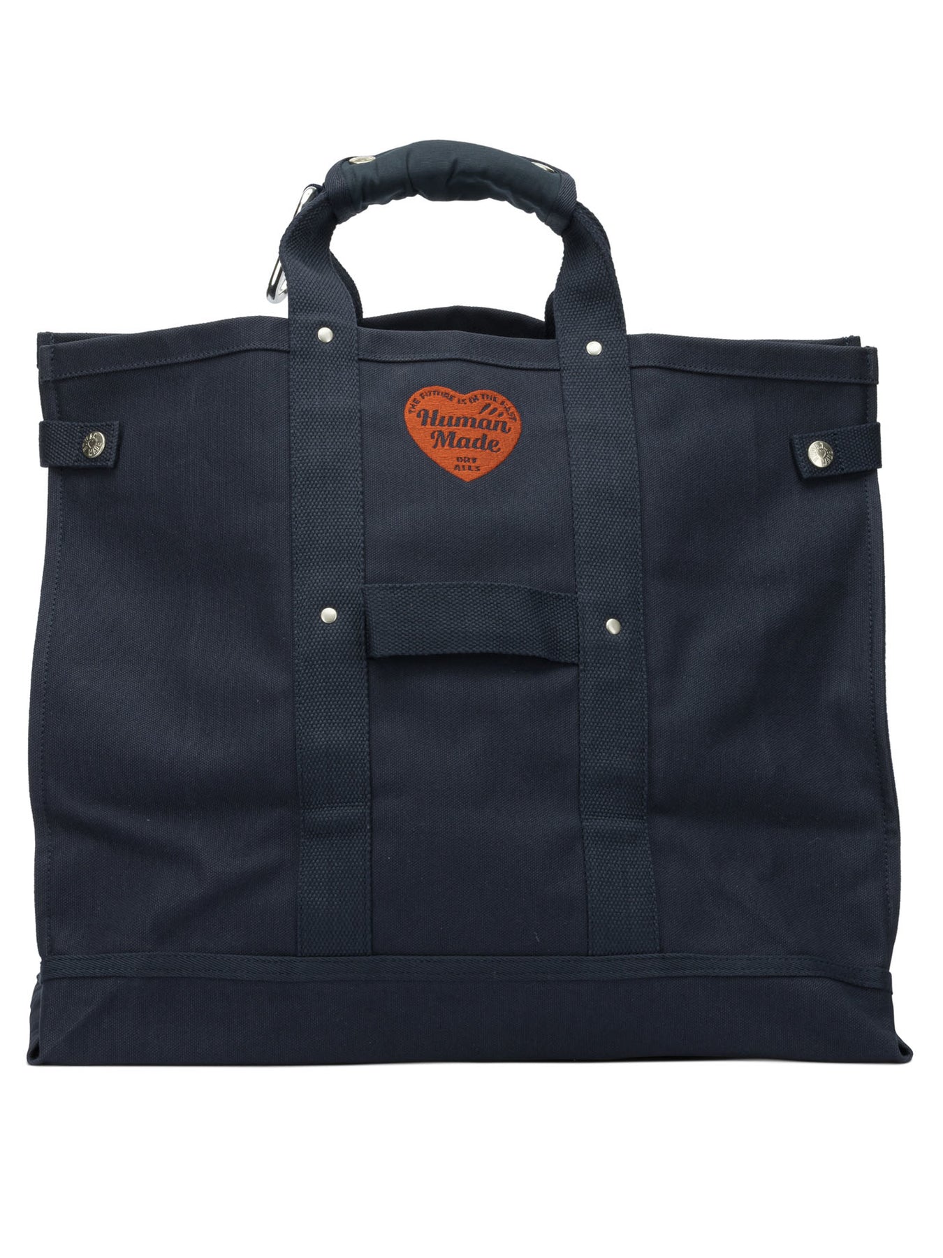 Human Made travel bag, wide structure made of thick canvas with a washed finish. Silhouette is defined by clean lines and soft corners, designed to hold up to A3-size documents. Construction includes reinforcement points in areas of greatest stress. Heart motif printing and embroidery distributed across the surface. Double handles and integrated functional details for carrying. || - Thick, tightly woven canvas, durable and sturdy - Washed finish with matte texture - Heart motif print and embroidery - Snap hook attached to the handle - Adjustable side tabs - Logo snap buttons - Integrated inside pocket