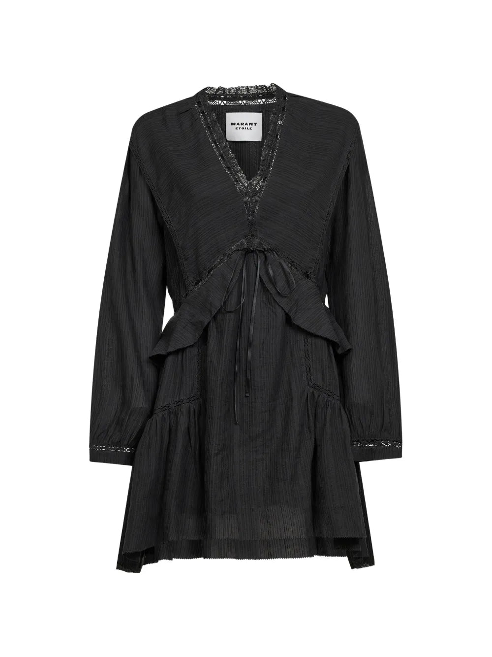 Ruffled dress with lace trim Black V-neck with lace trim, bib detail, long sleeves, asymmetrical hem, gathered waist Composition 60% cotton, 36% linen, 4% viscose Washing Instructions Read the manufacturer`s instructions ID RO0974FAD1J11E