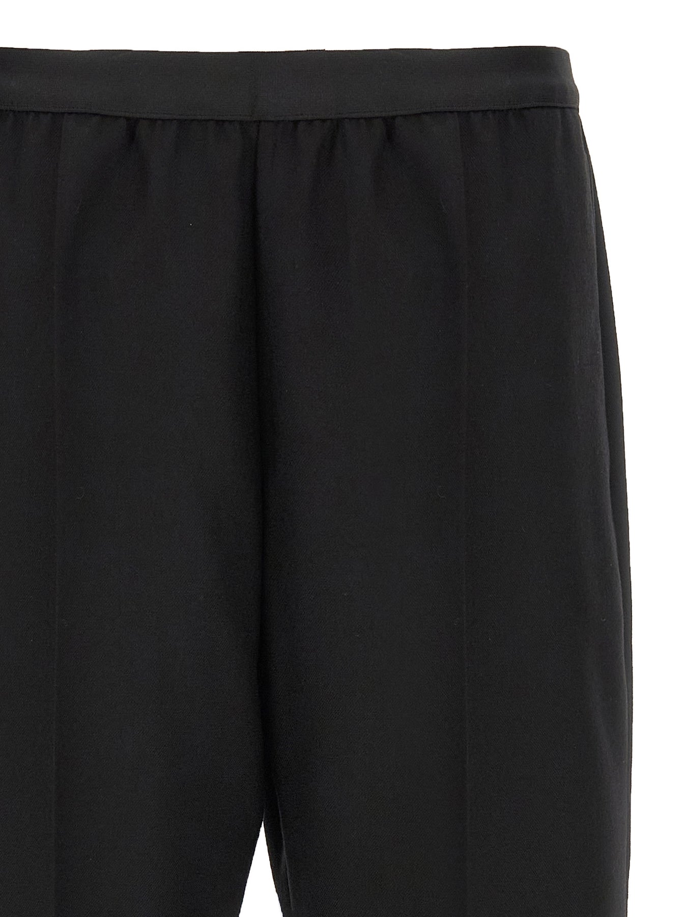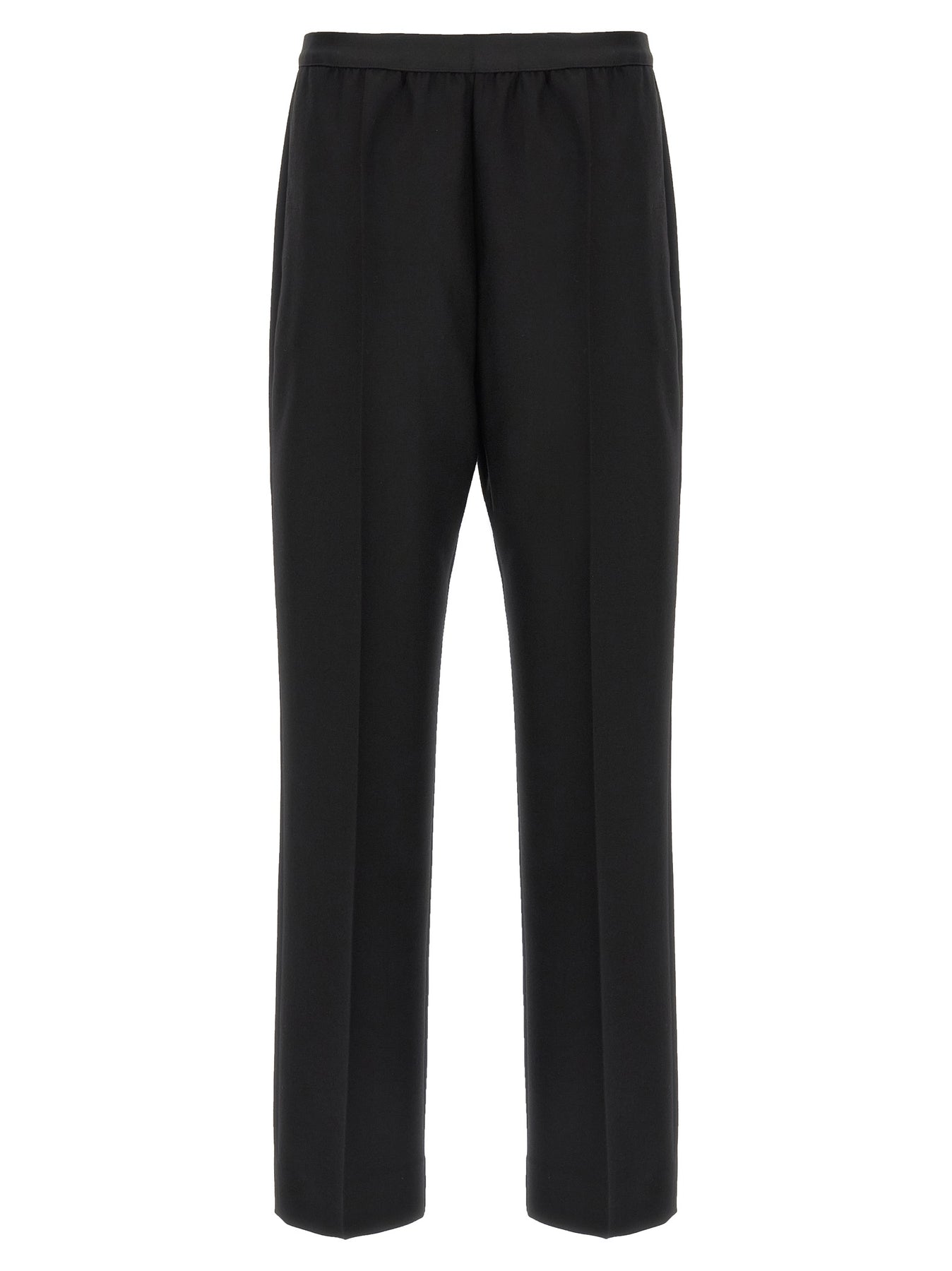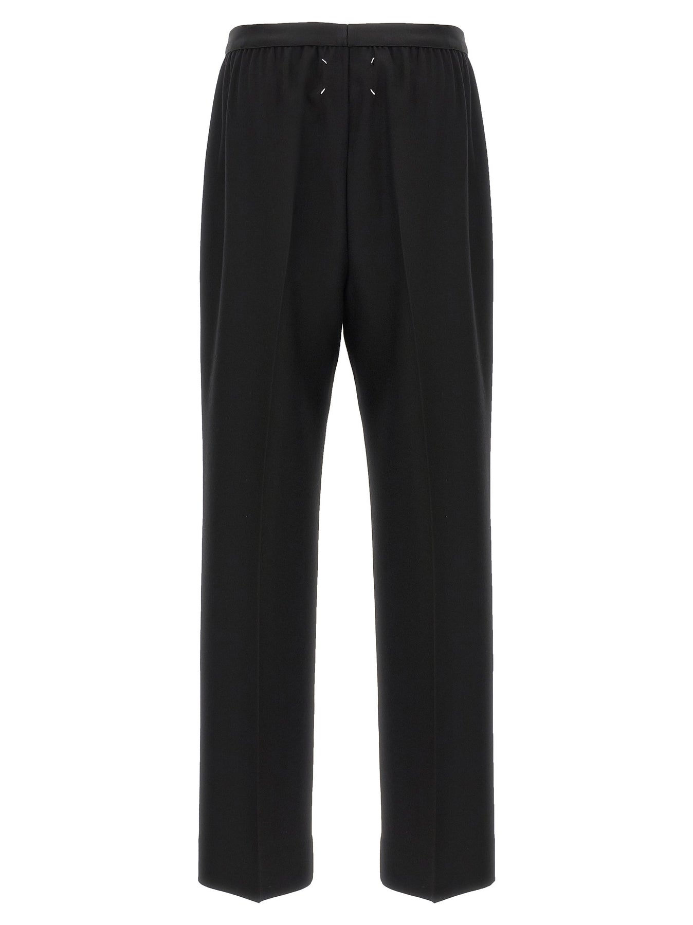 Virgin wool trousers, straight leg, stretched pleat, elastic waistband, pockets, 'Four Stitches' at the back.