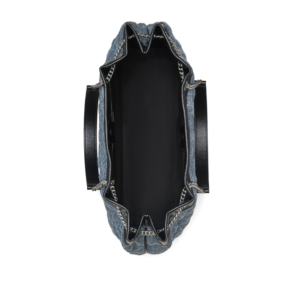 indigo blue concealed magnetic fastening adjustable chain-link shoulder strap main compartment appliqué logo