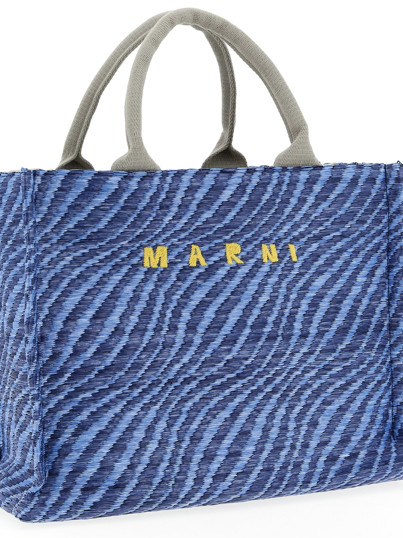 Two-tone handbag in woven raffia effect fabric, front logo embroidery, double fixed ribbon handle, inner hook closure with leather tape, rigid bottom, fixed oblique ribbon shoulder strap. Handcrafted product, any imperfections are to be considered characteristics of uniqueness.