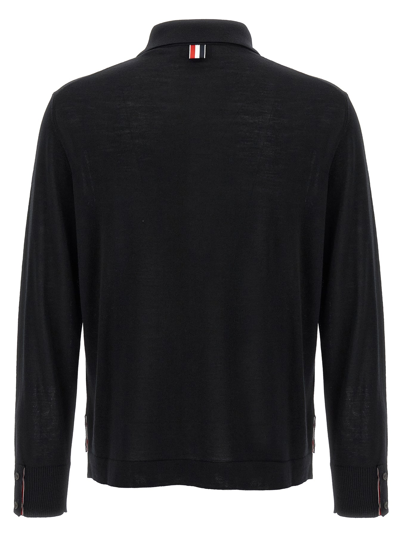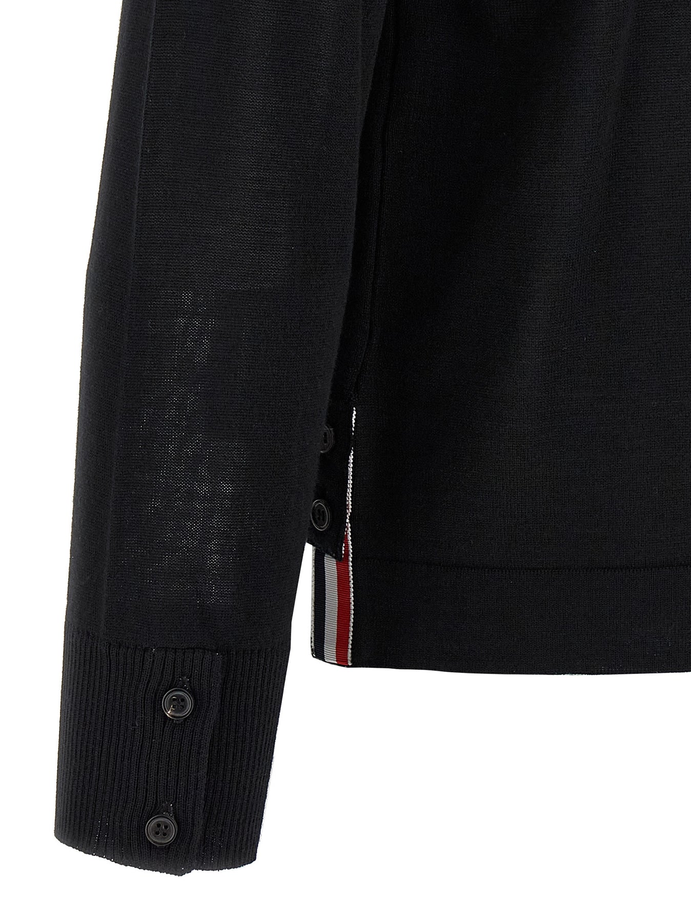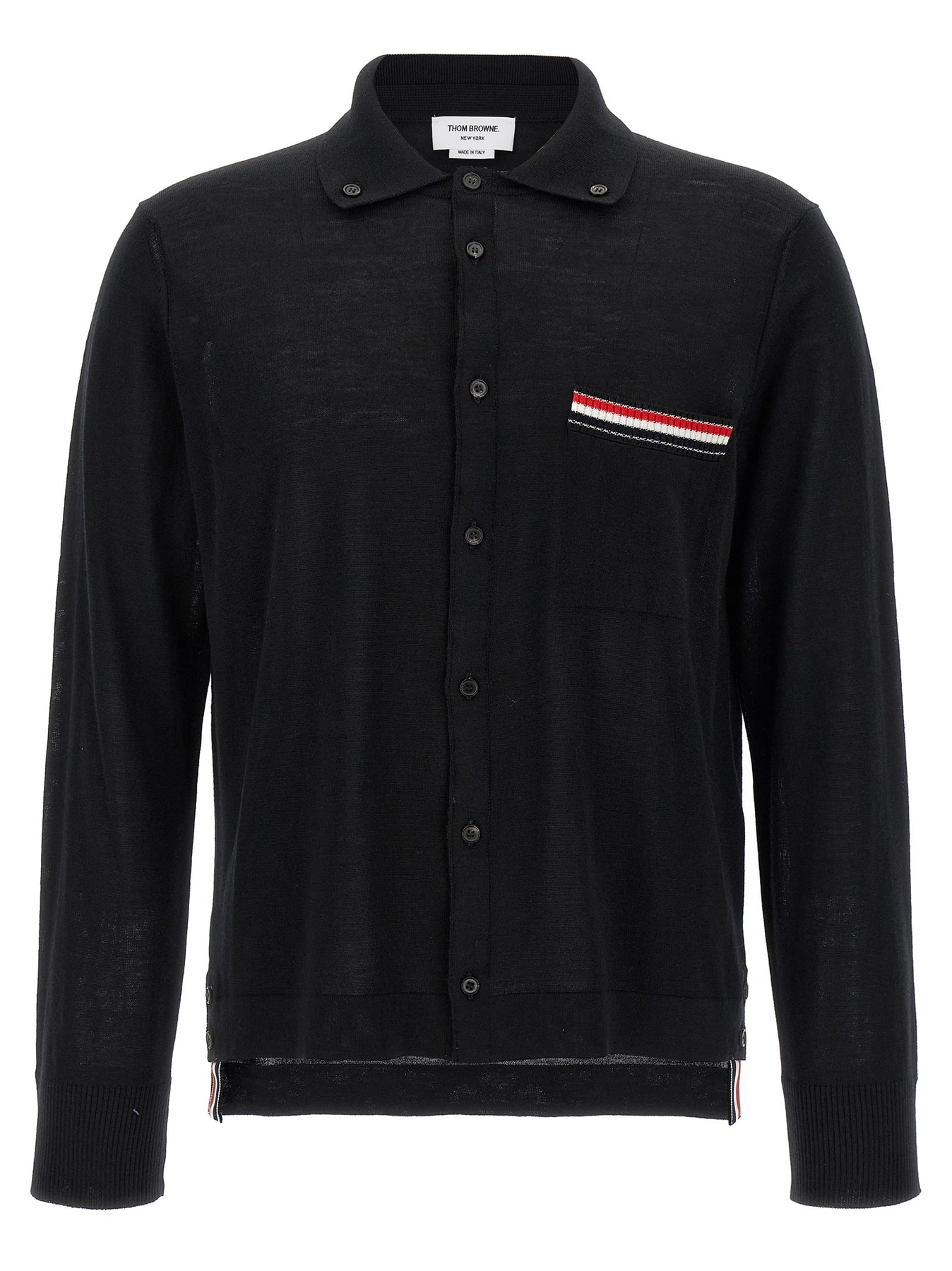 'Button Down' wool cardigan with shirt collar, button closure, patch pocket, side slits with 'RWB' detail, long sleeves with cuffs and buttons, asymmetrical length.