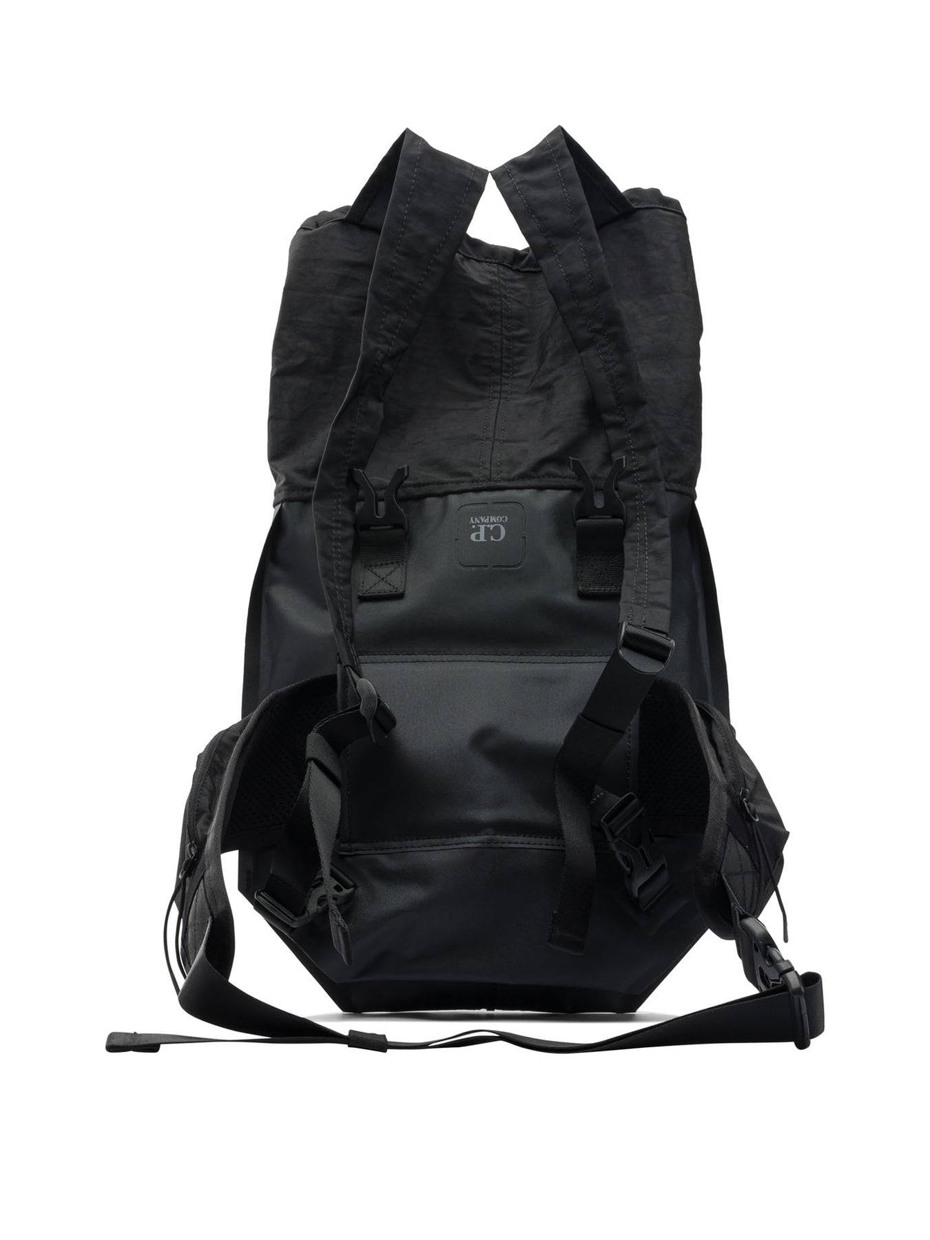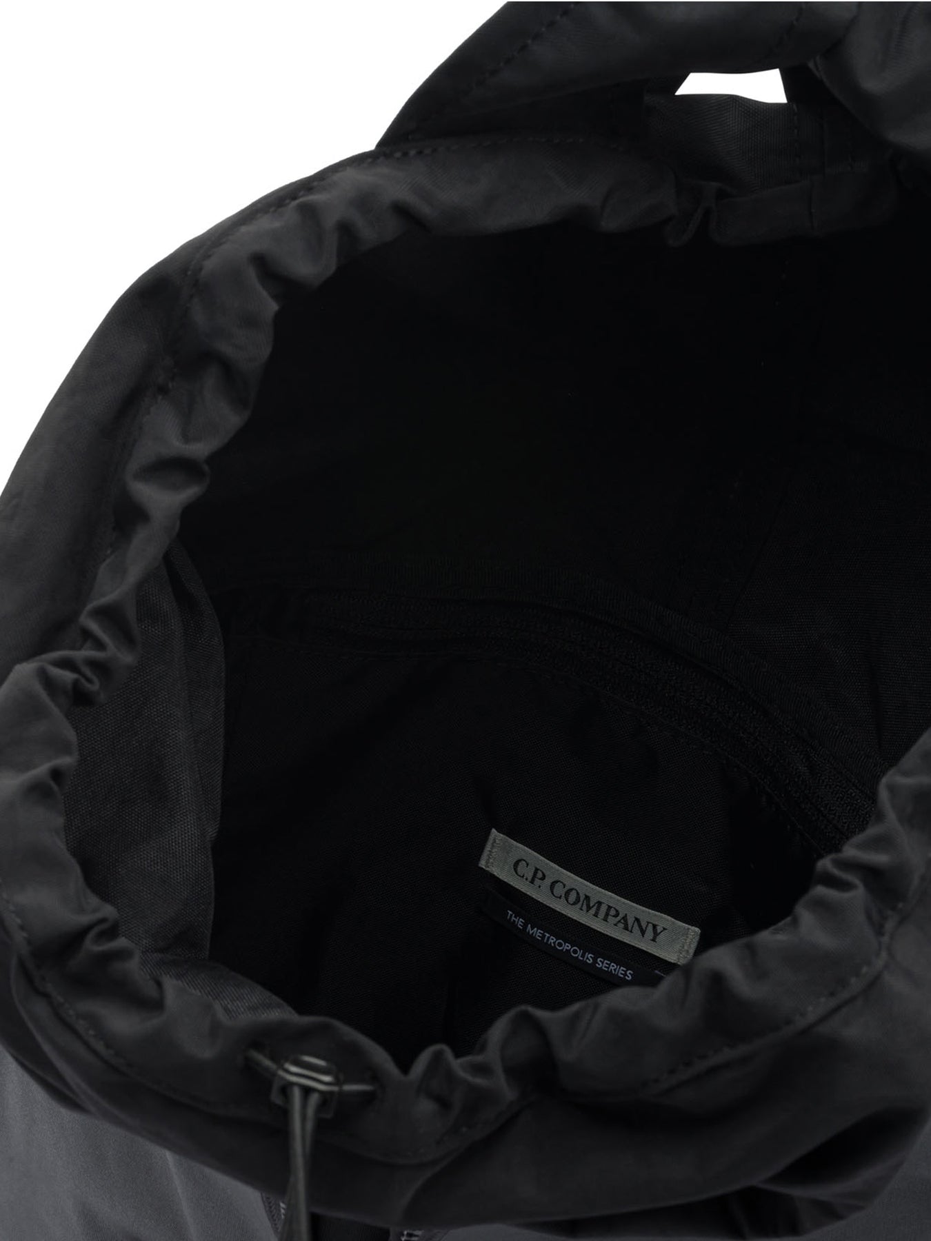 C.P. Company "Metropolis" backpack, made of Rubber Reps Mixed, a 210-denier nylon with rubberized reps back. The structure is designed for modular use, adapting to both backpack and shoulder bag functions. Compact silhouette, drawstring top closure, front zippered pocket and concealed snaps. Shoulder straps are adjustable and have a buckle closure. || - Convertible use: backpack or shoulder bag - Adjustable shoulder straps with buckle closure - Drawstring top closure - Front pocket with zipper and hidden snaps - Laser-printed badge logo on the back - Removable shoulder strap with integrated zipper pocket and rubberized badge logo