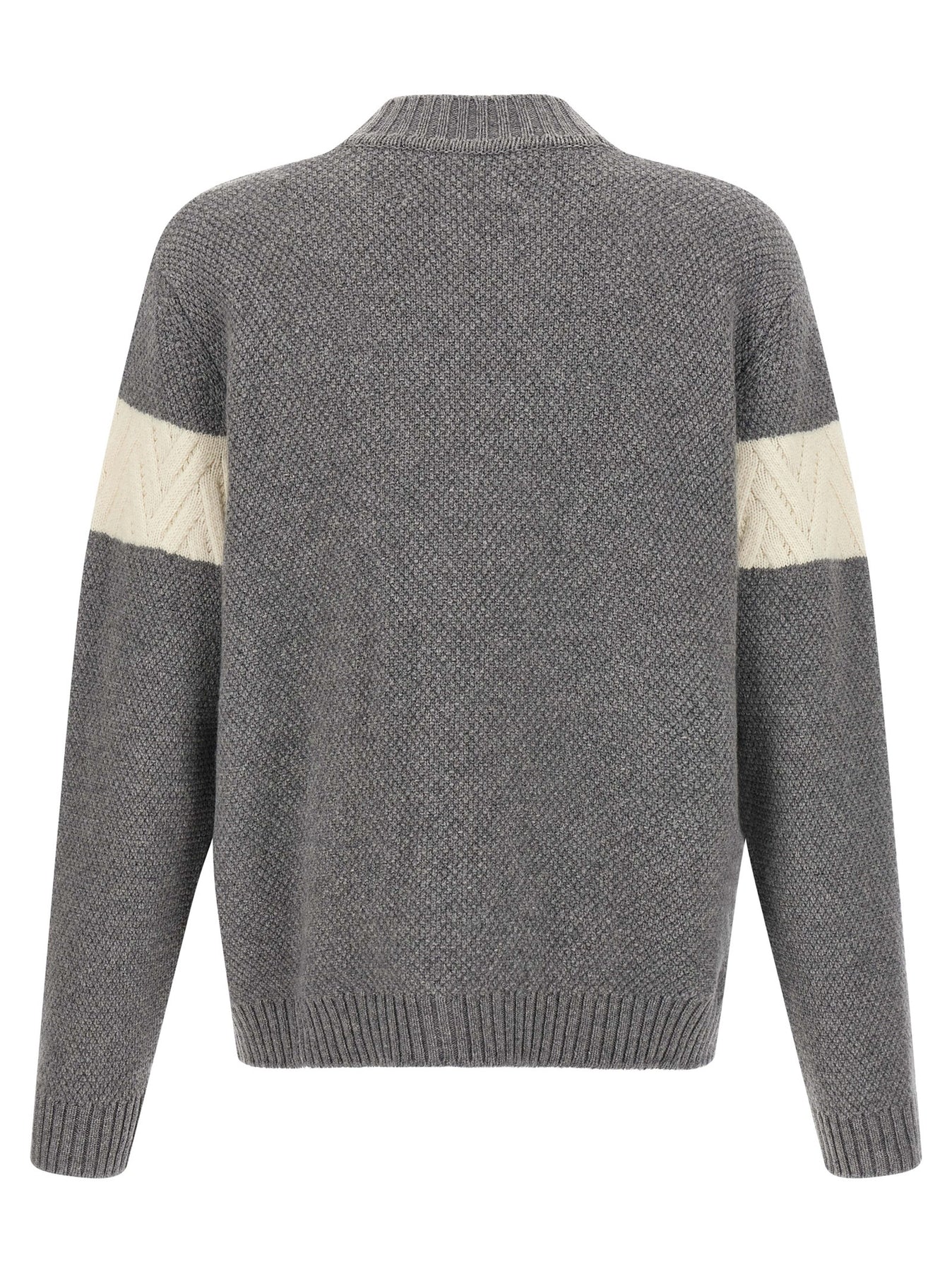 Wool cardigan, patchwork effect inlays, V-neck, front button closure, long cuffed sleeves.