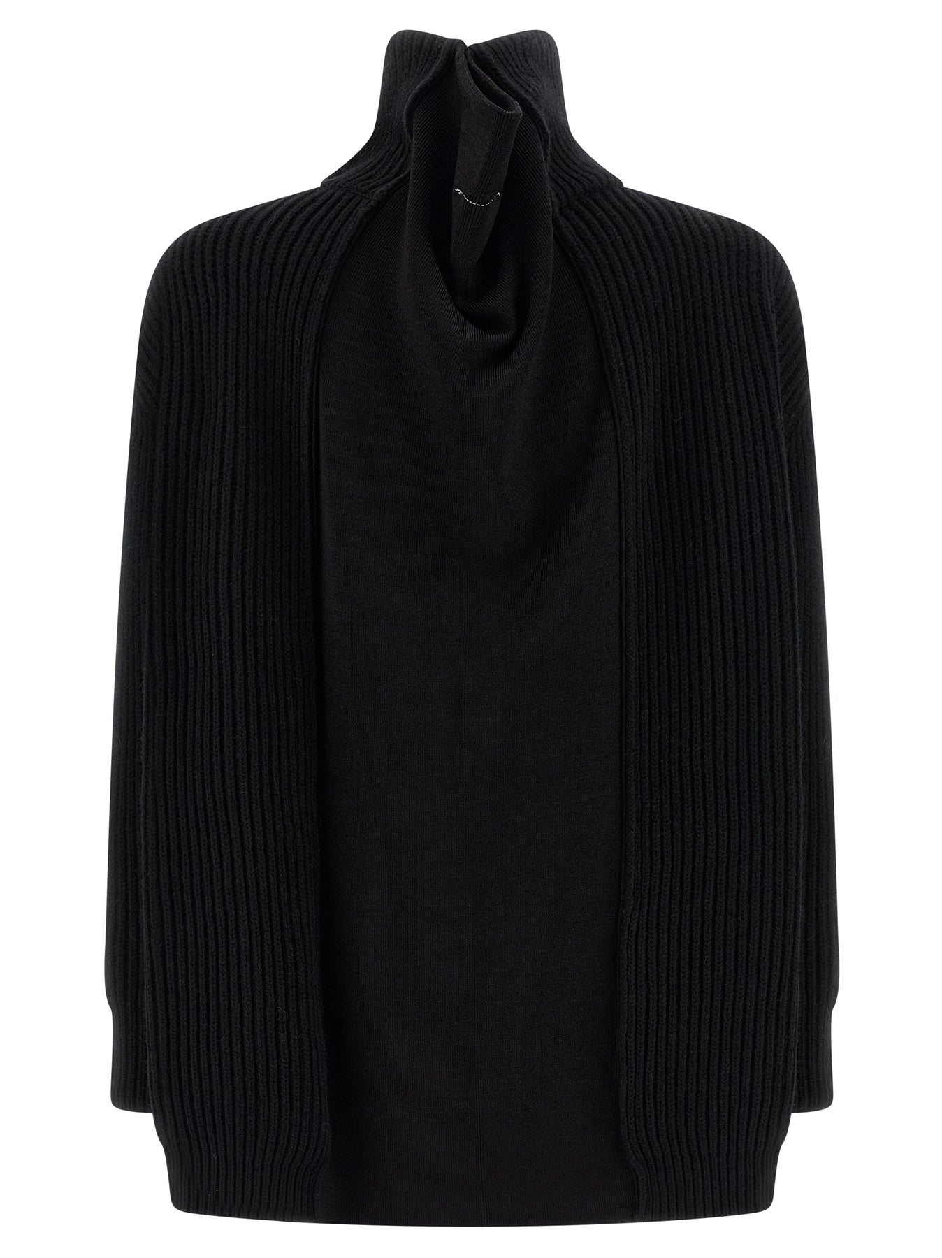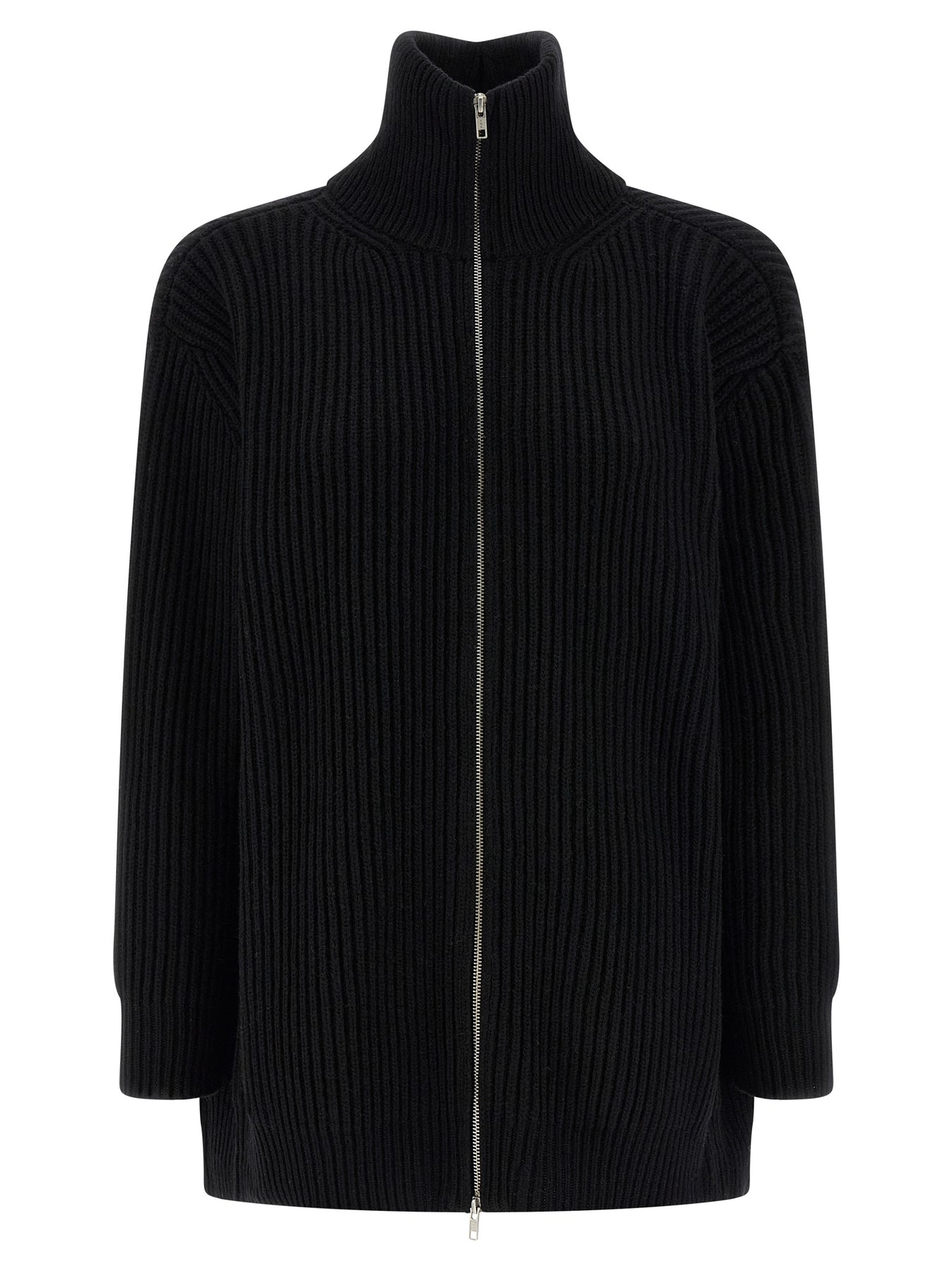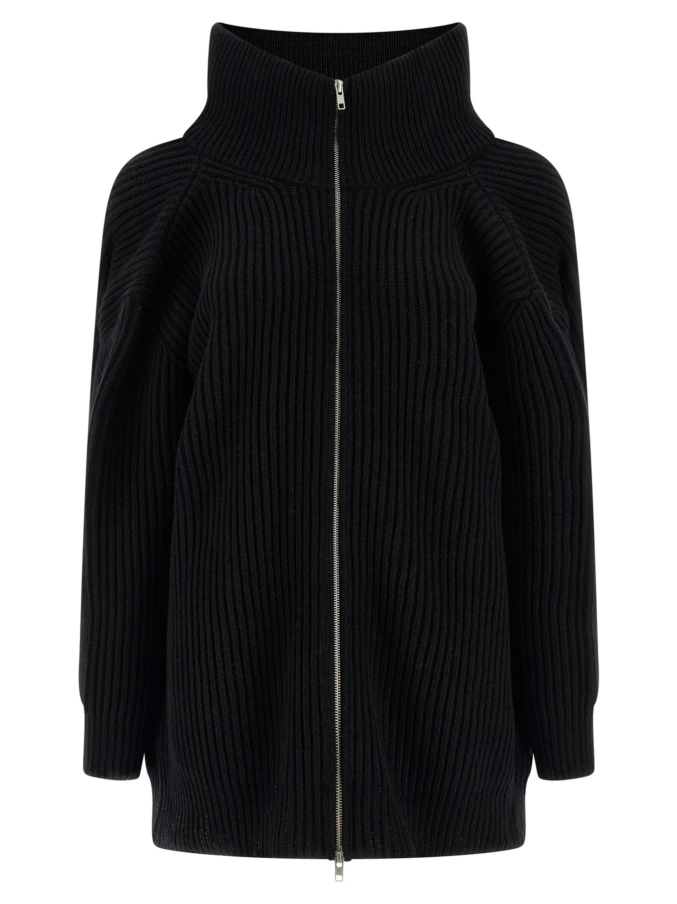 Cardigan mini ribbed wool knit dress with high neck, front zip closure, long sleeves with dropped shoulder, tone-on-tone stretch knit back panel to adjust width, 'White stitch line' at the back.
