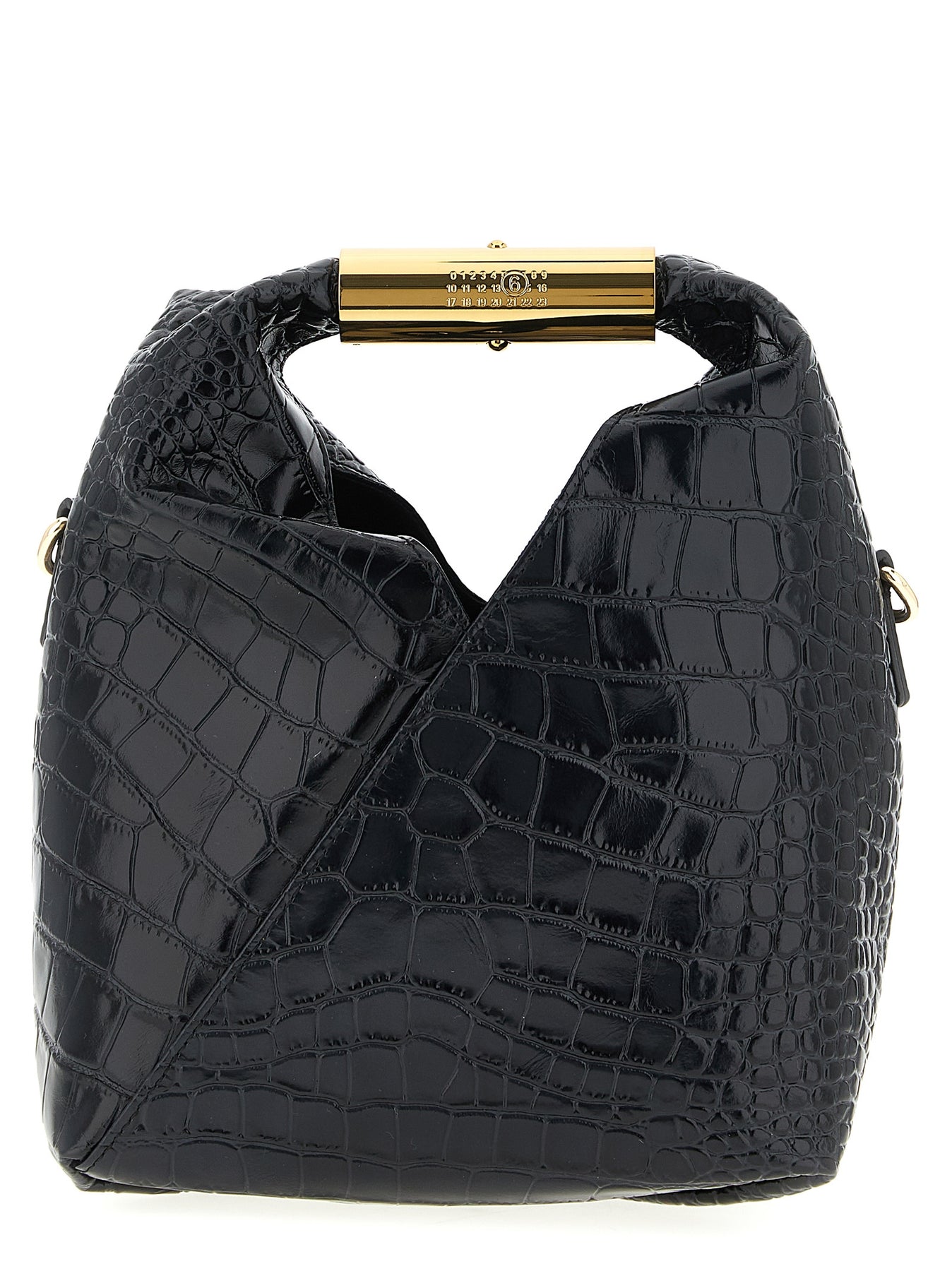 Small 'Japanese' handbag in shiny croc print leather, cotton lining, triangle silhouette with angular pleats, handle with metal opening mechanism and 'Numeric signature MM6' engraved logo, front 'White stitch line', inner snap button closure, Adjustable shoulder strap.