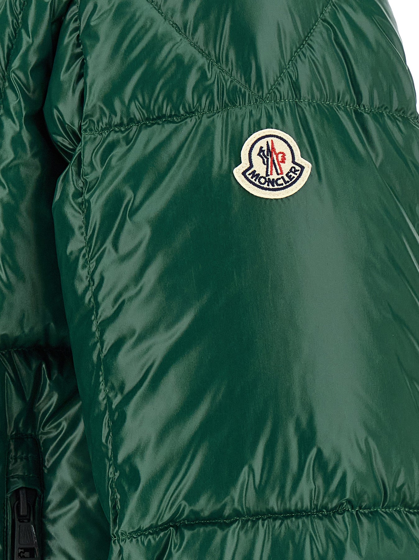 Parana' nylon laqué down jacket with glossy quilted finish and goose down padding, contrast lining, adjustable and removable hood, standing collar, front zip and snap button closure, pockets, long sleeves with elastic cuffs and felt logo patch, drawstring at the hem.