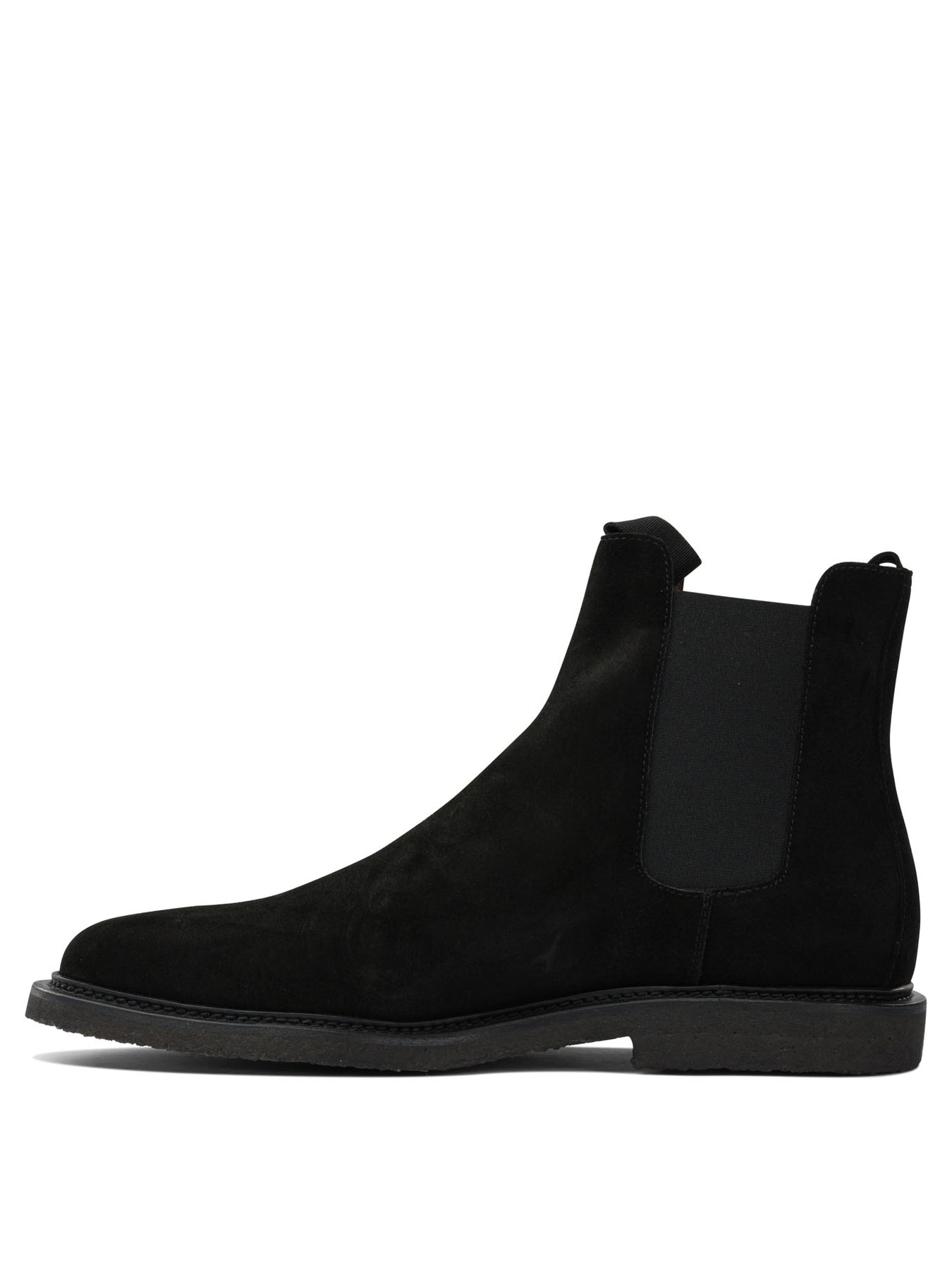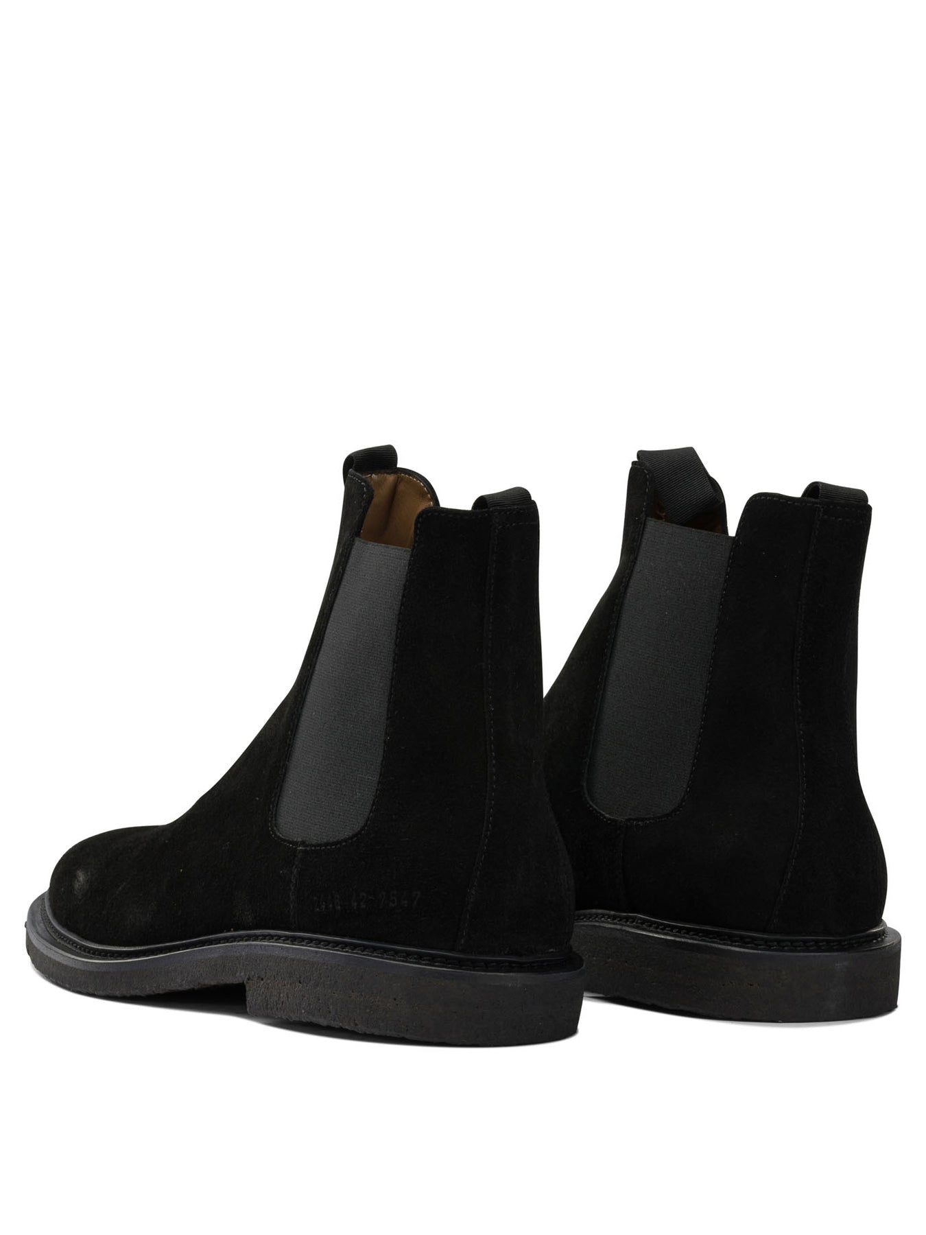 Common Projects suede chelsea ankle boots made of suede leather, featuring a slip-on construction with elastic side inserts. The upper features a linear silhouette with a clean profile and minimalist structure. The model features a rubber sole that defines the base and provides support while wearing. Elastic inserts promote ease of wear and stability on the ankle. || - Suede leather upper - Elasticized inserts on the sides - Rubber outsole - Slip-on closure - Low profile construction - Rear insert for fit