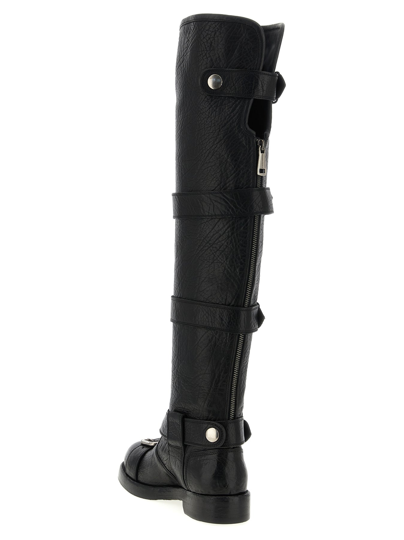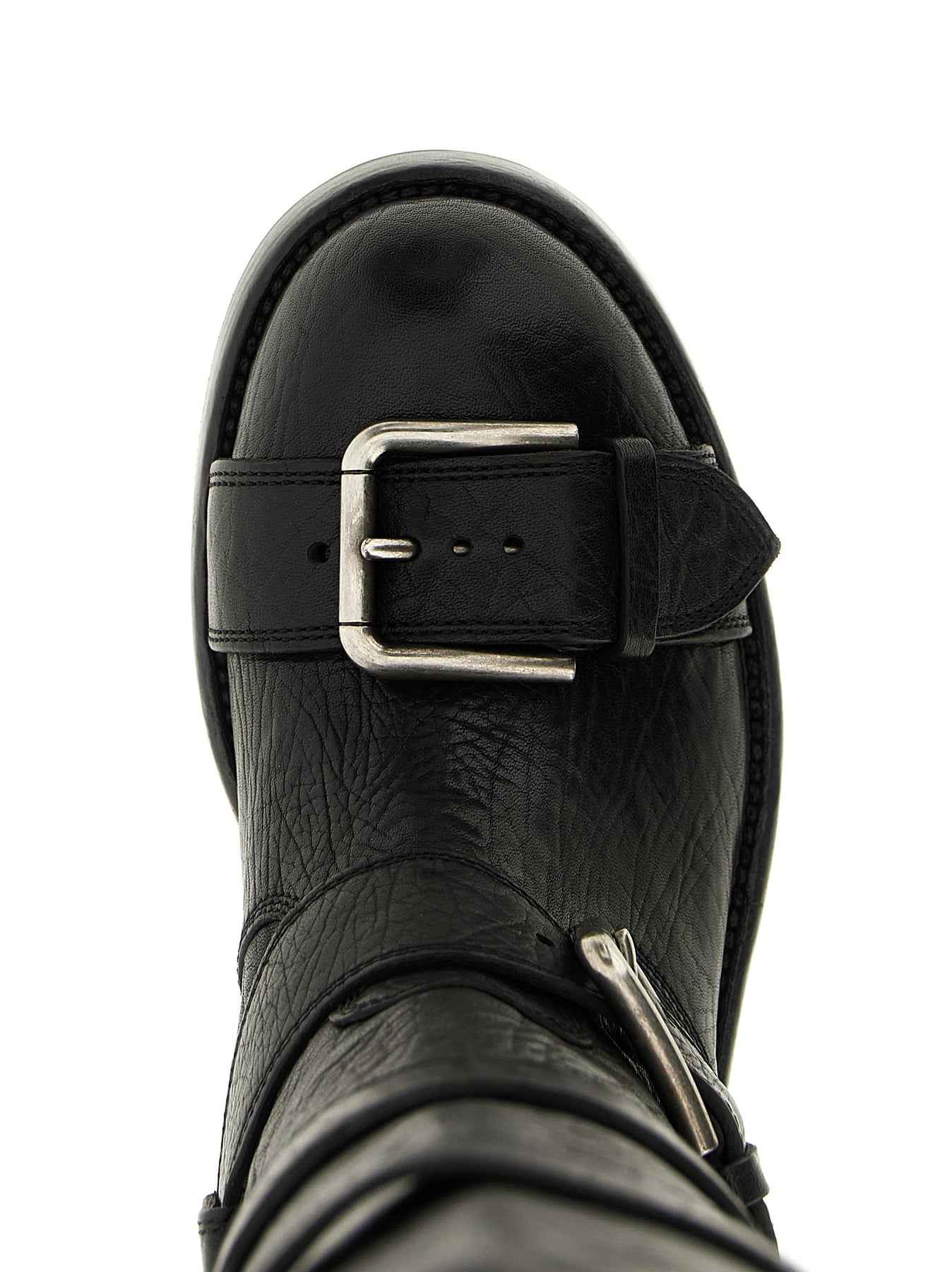 'Bernini' hammered horse leather boots, biker-inspired model, rounded toe, adjustable straps, back zip closure, leather sole with non-slip VIBRAM® rubber island.