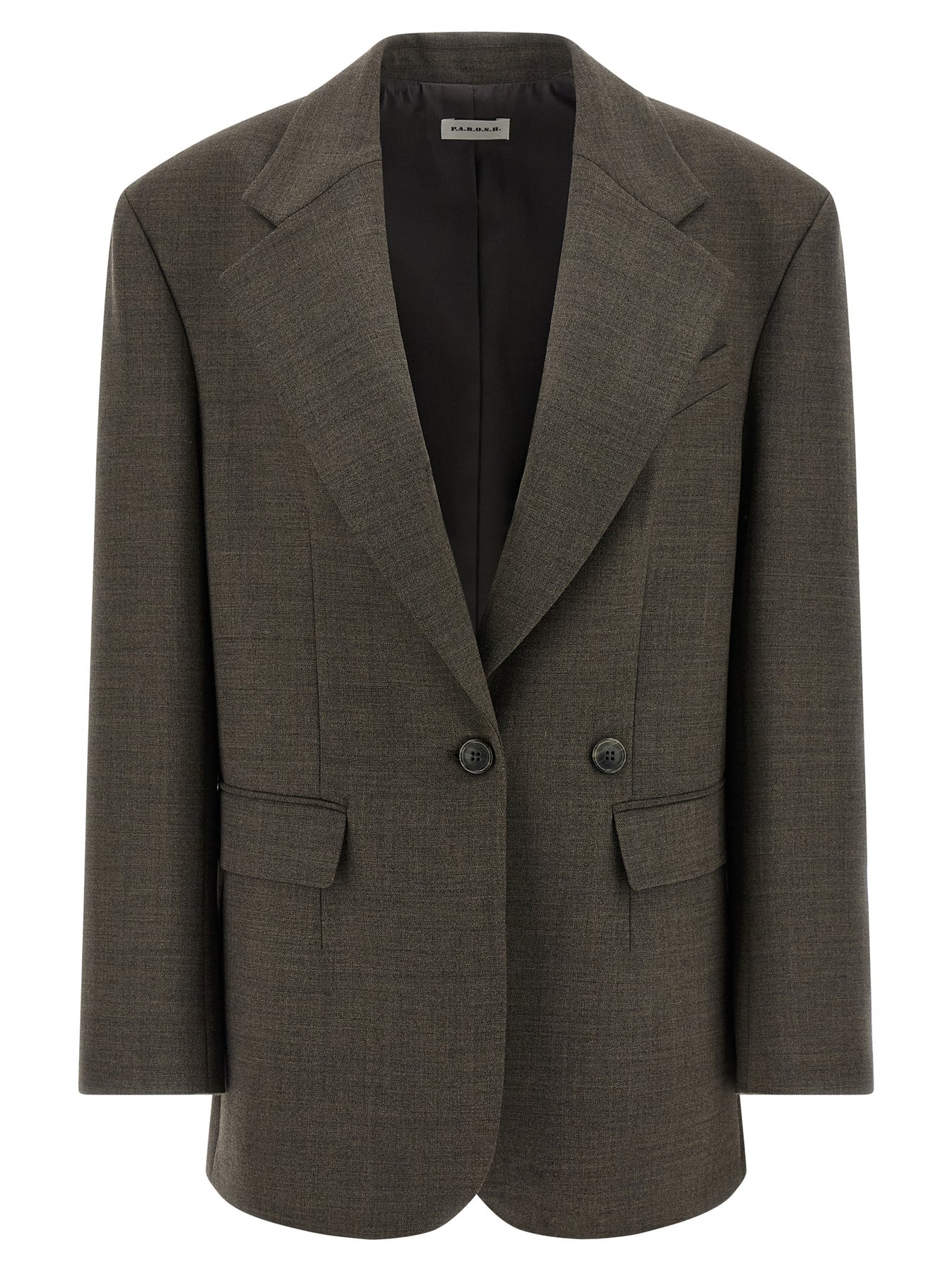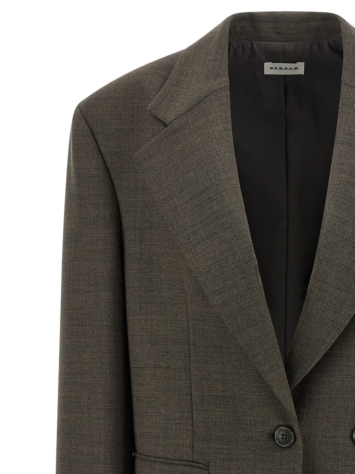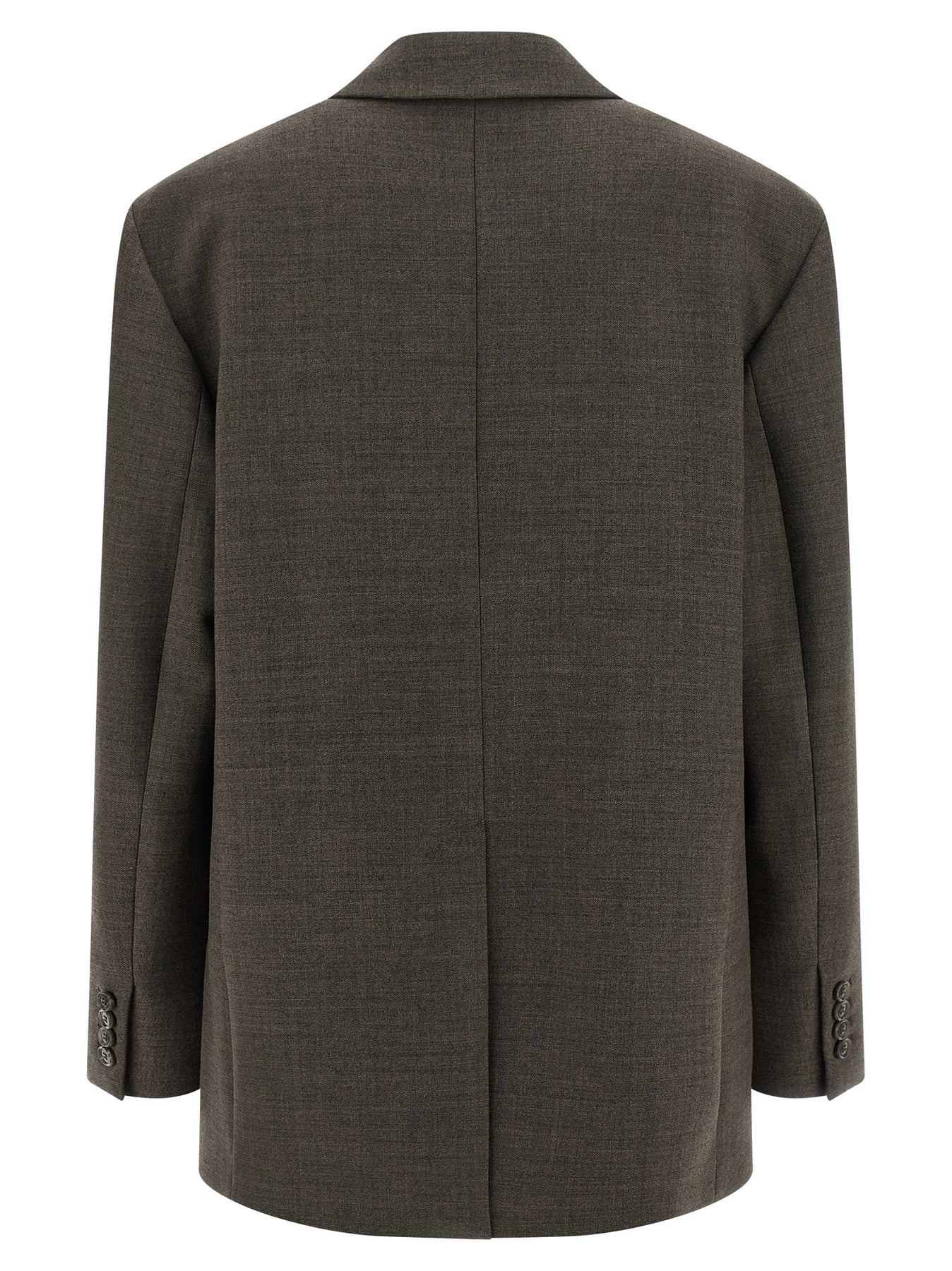 Single-breasted Powo blazer in cool mélange wool with front asymmetric button closure, mirror lapels, breast pocket, flap pockets, long sleeves, structured shoulder strap, back split, and viscose blend lining.