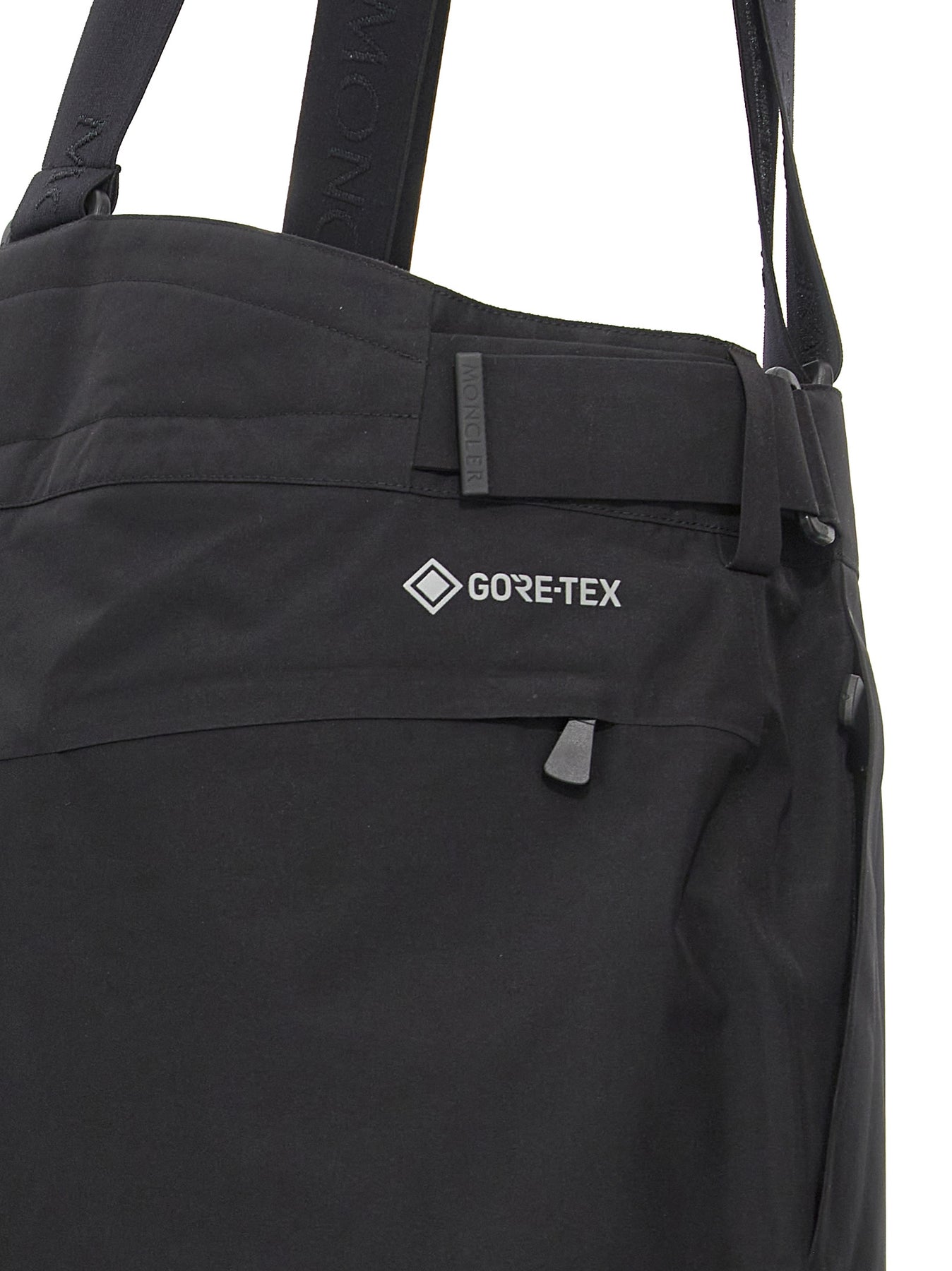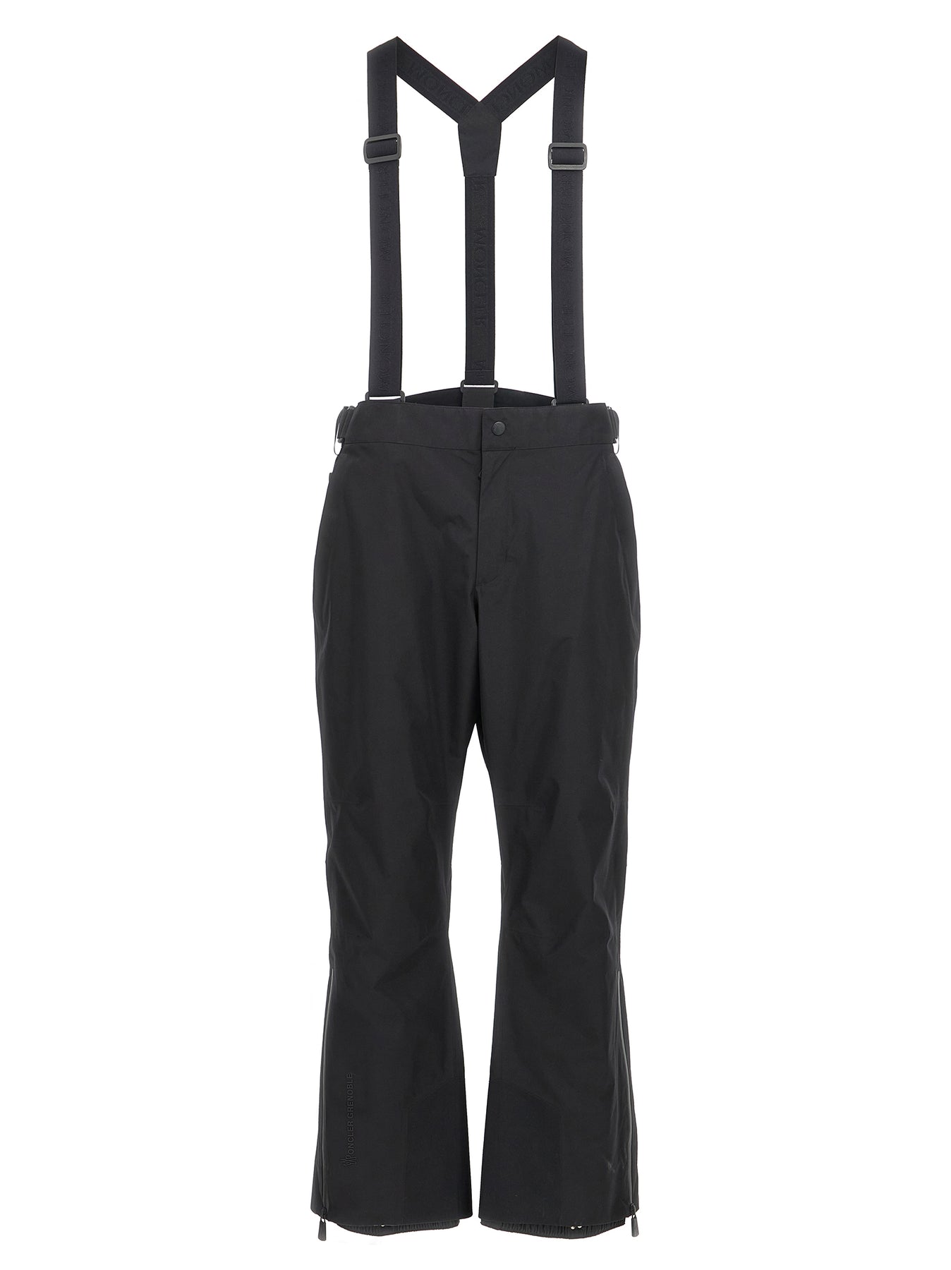 Ski pants in water-repellent and slightly padded technical fabric, zip and snap button closure, pockets, side zips, adjustable waist with velcro bands, adjustable braces, foot gaiters and zip detail.