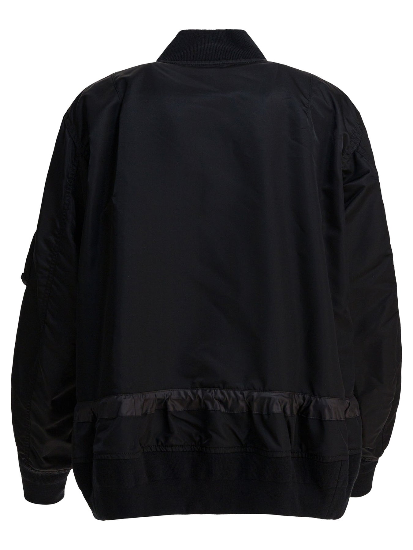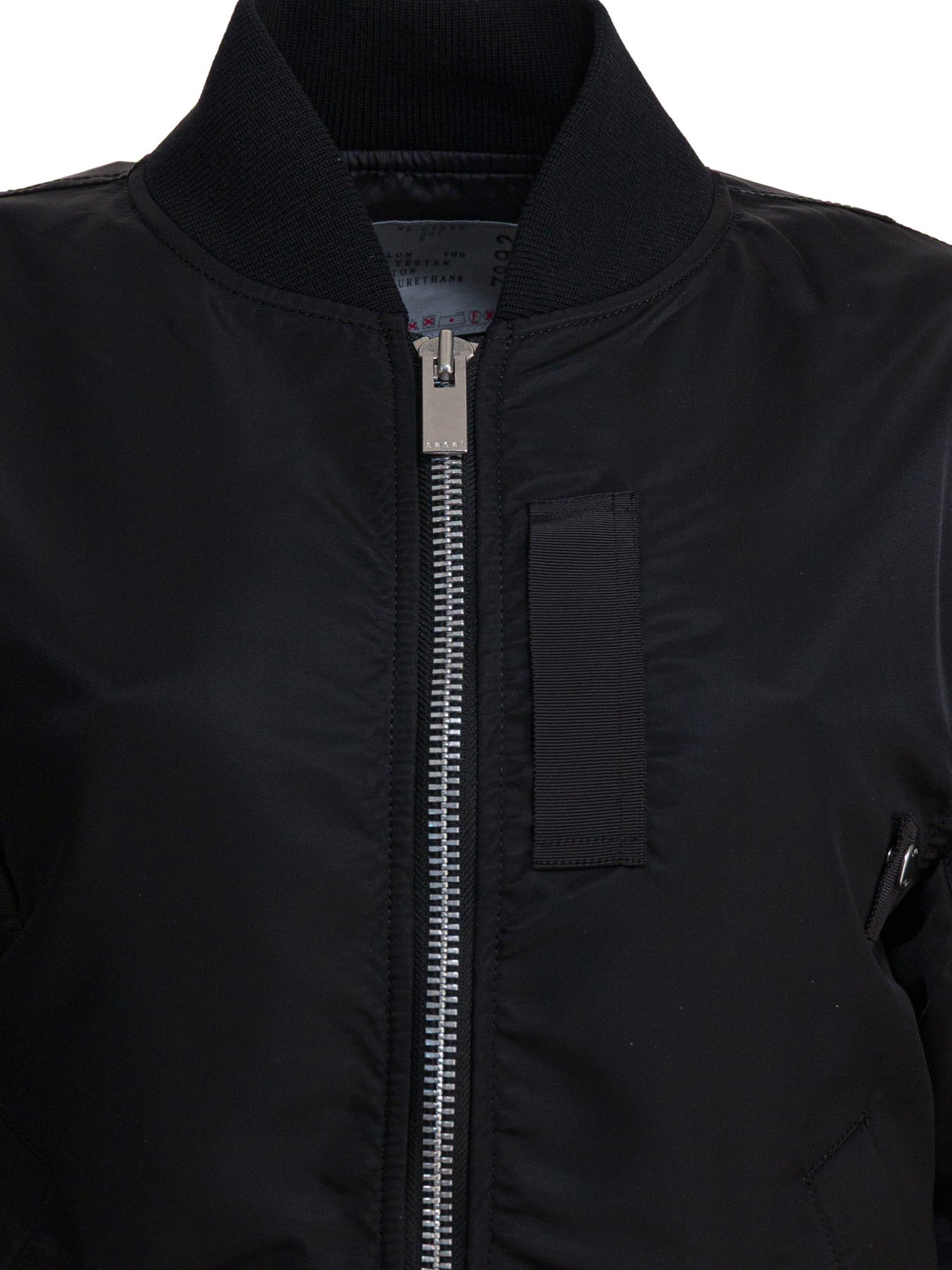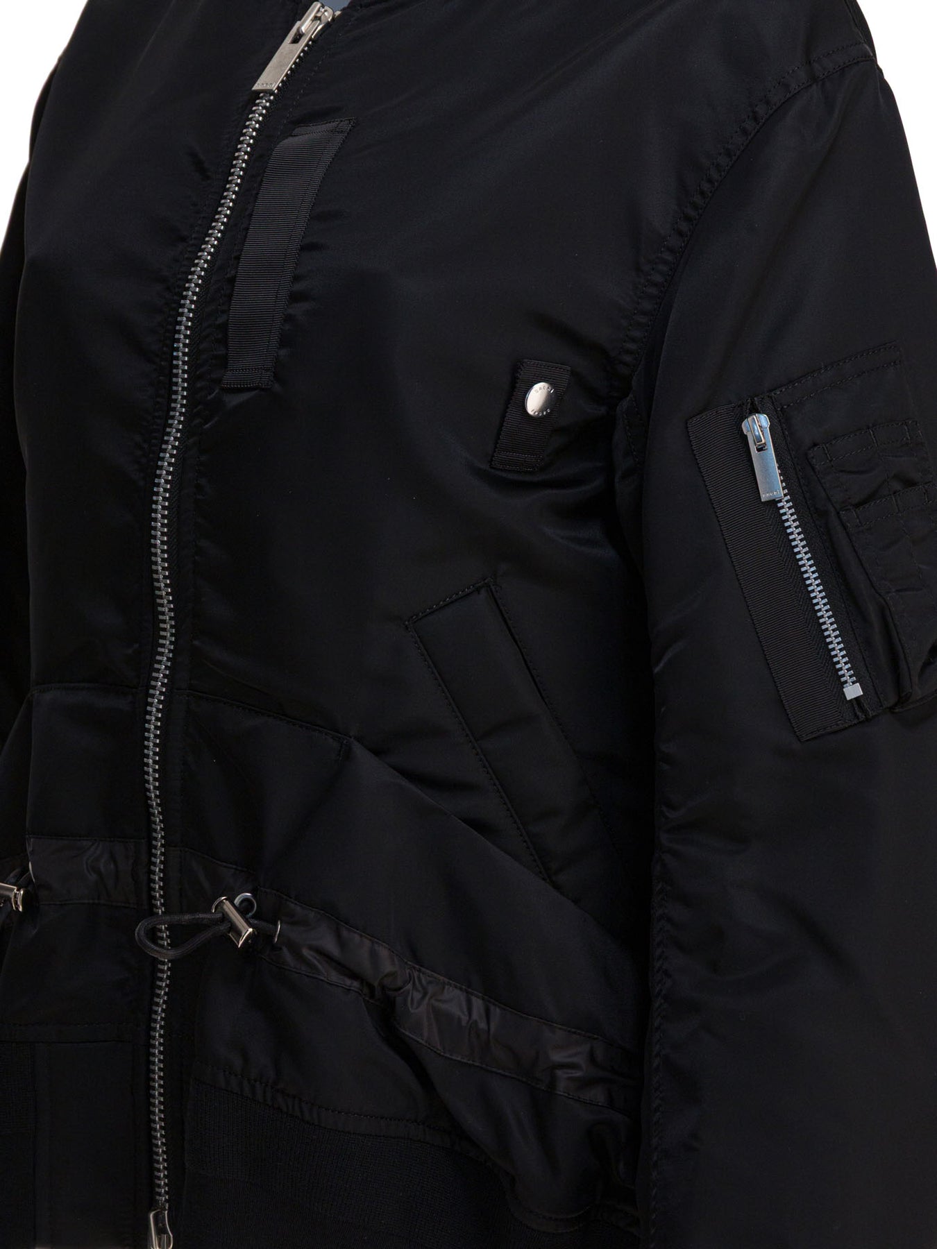 Sacai nylon twill bomber jacket, construction with tightly woven technical fabric that provides structural strength. Ribbed elastic profiles on collar, hem and cuffs. Model features a soft silhouette, with adjustment via internal drawstring waist. Slanted welt pockets with snap button closure implement functionality, while a zippered sleeve pocket adds a utilitarian detail. Inner synthetic padding. || - Ribbed hem, collar and cuffs - Adjustable drawstring waistband - Zipper pocket on sleeve - Slanted welt pockets with snap buttons