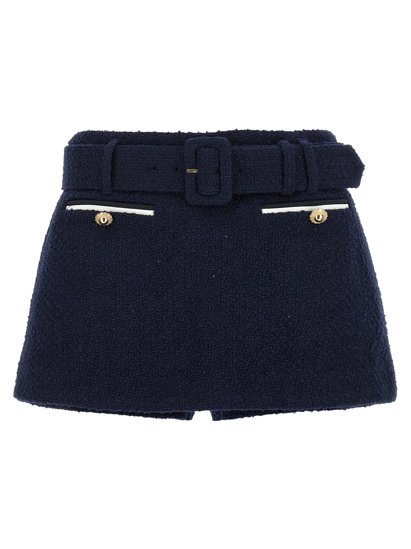 Bouclé wool blend skort, front pockets, back zip closure, removable belt.