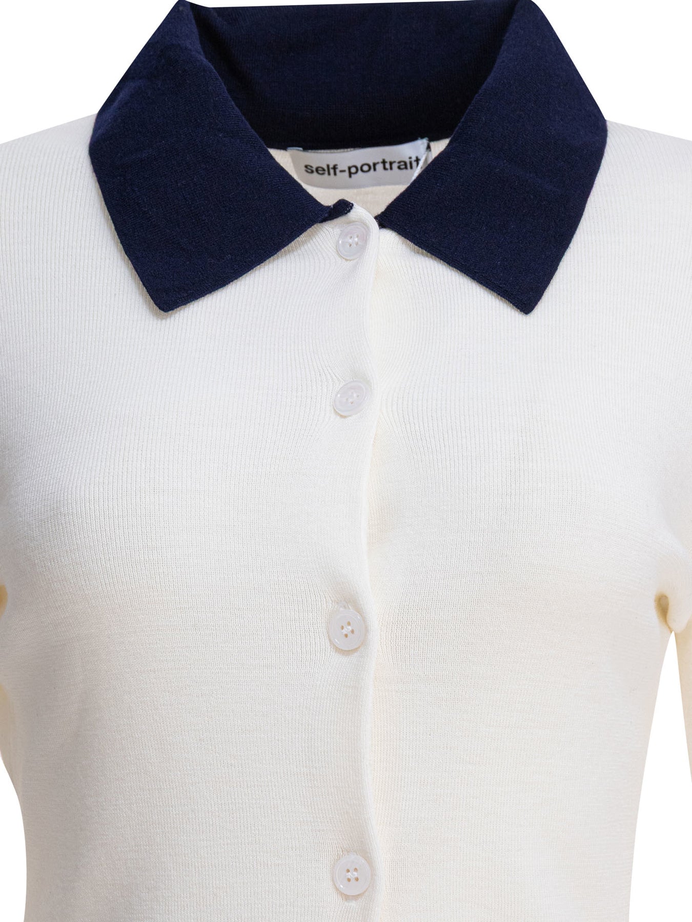 Self-portrait merino wool cardigan made with medium-fine knit fabric and linear construction. The structure features a regular silhouette defined by straight shoulders and a contrasting collar. The main material is merino wool, selected for its stretch properties, with a smooth finish. Front closure with applied buttons and finished edges. The cut is designed to maintain an essential, minimalist shape. || - Solid color - Long sleeves - Stretch fabric - Button closure on the front - Contrasting collar - Slim fit