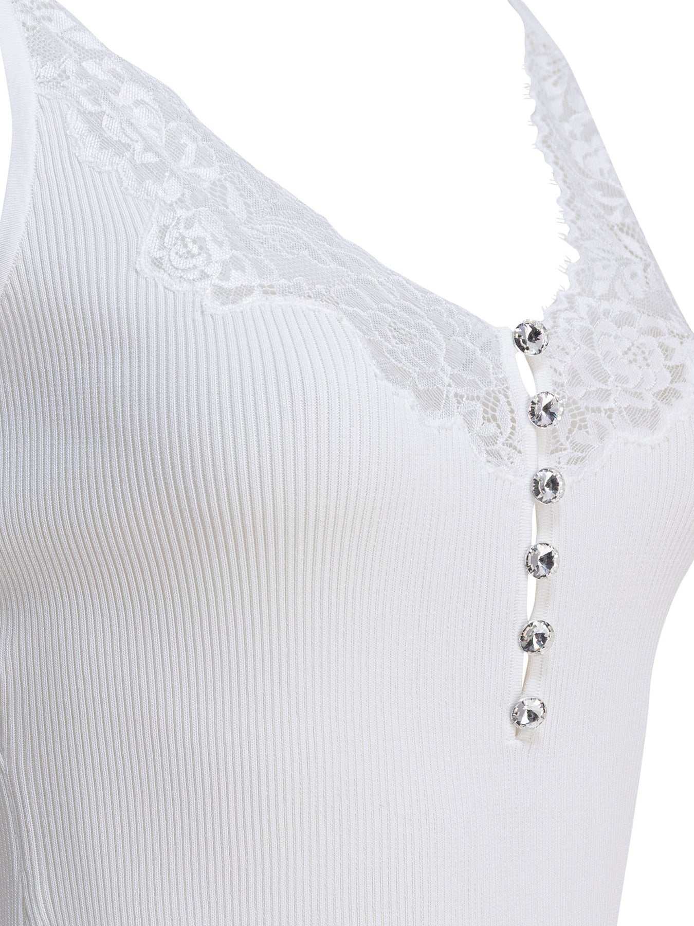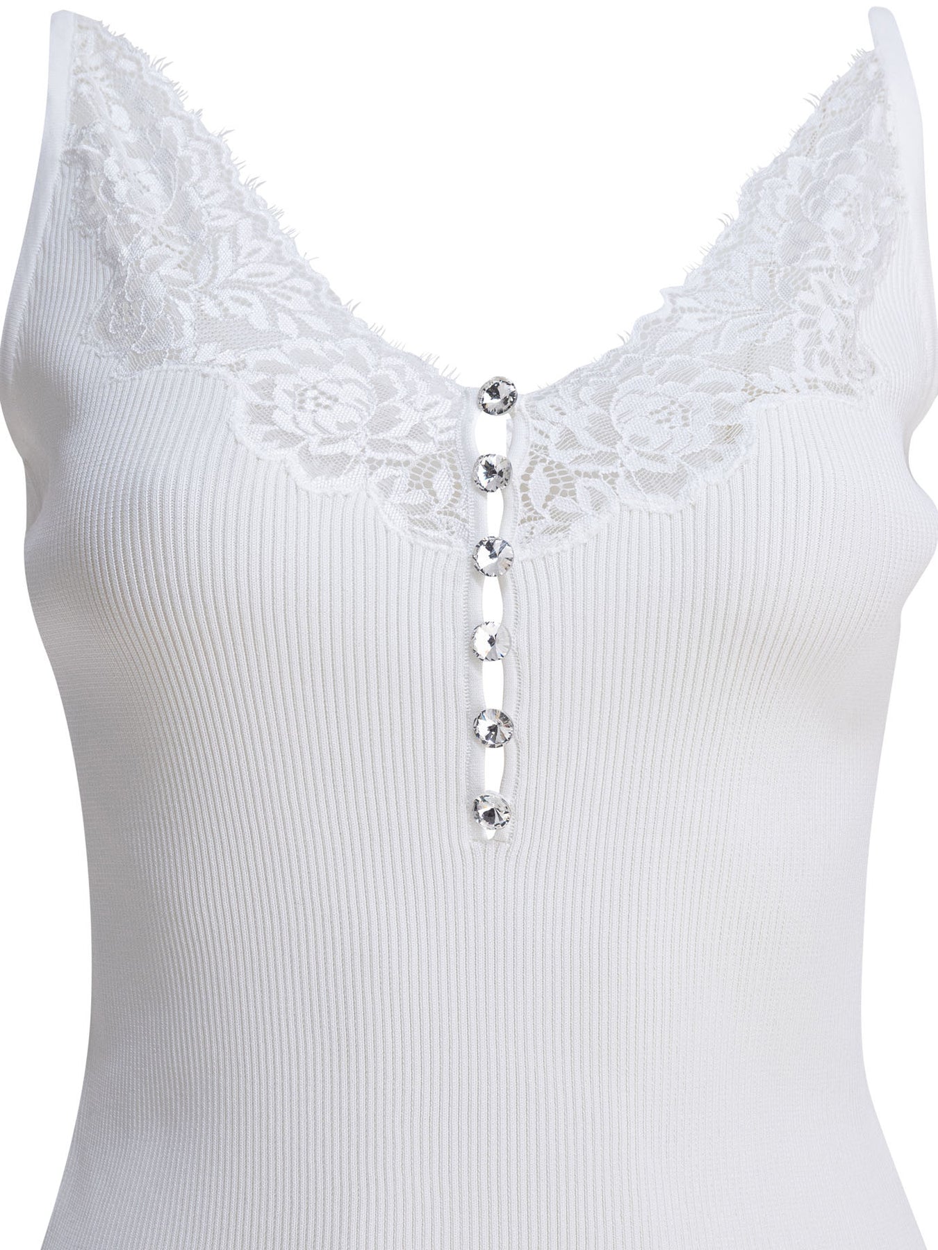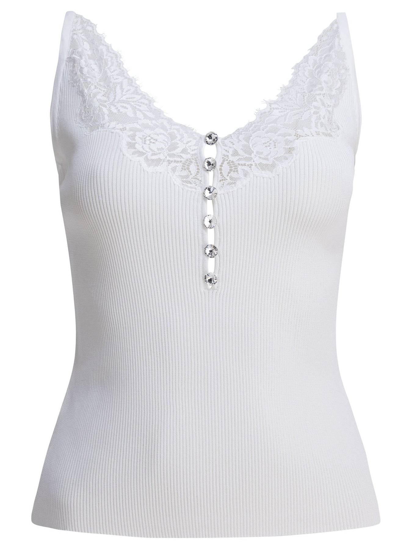 Self-portrait ribbed tank top with lace neckline made of stretch viscose knit with ribbed detailing. The construction features a fitted silhouette with a neckline finished with lace details. The garment features a front opening with diamond buttons and thin adjustable straps for a customized fit. Lace inserts are applied along the neckline to define the essential lines of the model. || - Solid color - Ribbed knit in stretch viscose. - Front opening with diamond buttons - Thin, adjustable straps - Applied lace details on neckline - Slim fit