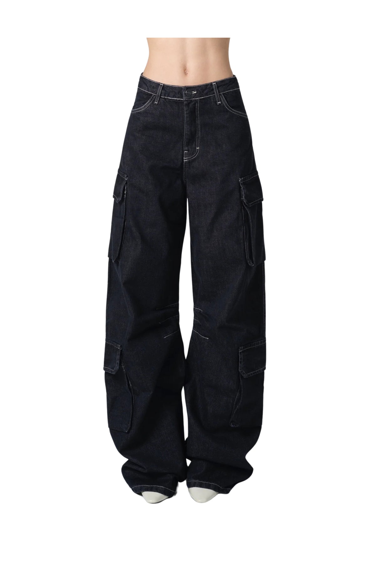 The Archivia Anema Cargo Jeans in Denim. Mid-rise design with zip and button closure. Features multiple pockets and belt loops.