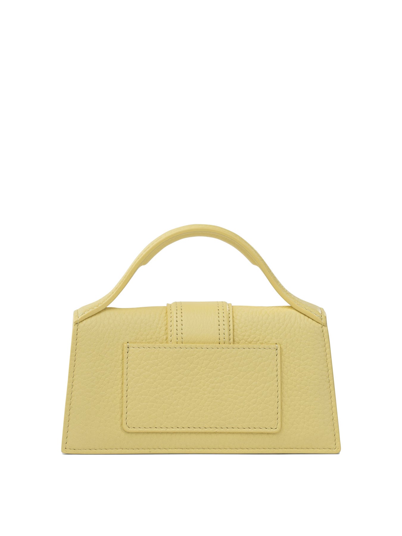 Jacquemus "Le Bambino" handbag made of grained leather with a compact structure. The model features a padded top handle and a geometric silhouette. Magnetic flap closure ensures a practical hold. Silver metal logo applied to the flap, exposed topstitching details and dyed edges. Internally, the full lining is cotton. On the back is a patch pocket. Removable long shoulder strap with engraved snap hook closure. || - Grained leather - Padded handle - Magnetic flap closure - Removable long shoulder strap with engraved lobster clasp closure - Patch pocket on the back - Cotton lining - Silver metal logo and trim - Exposed topstitching - Dyed edges