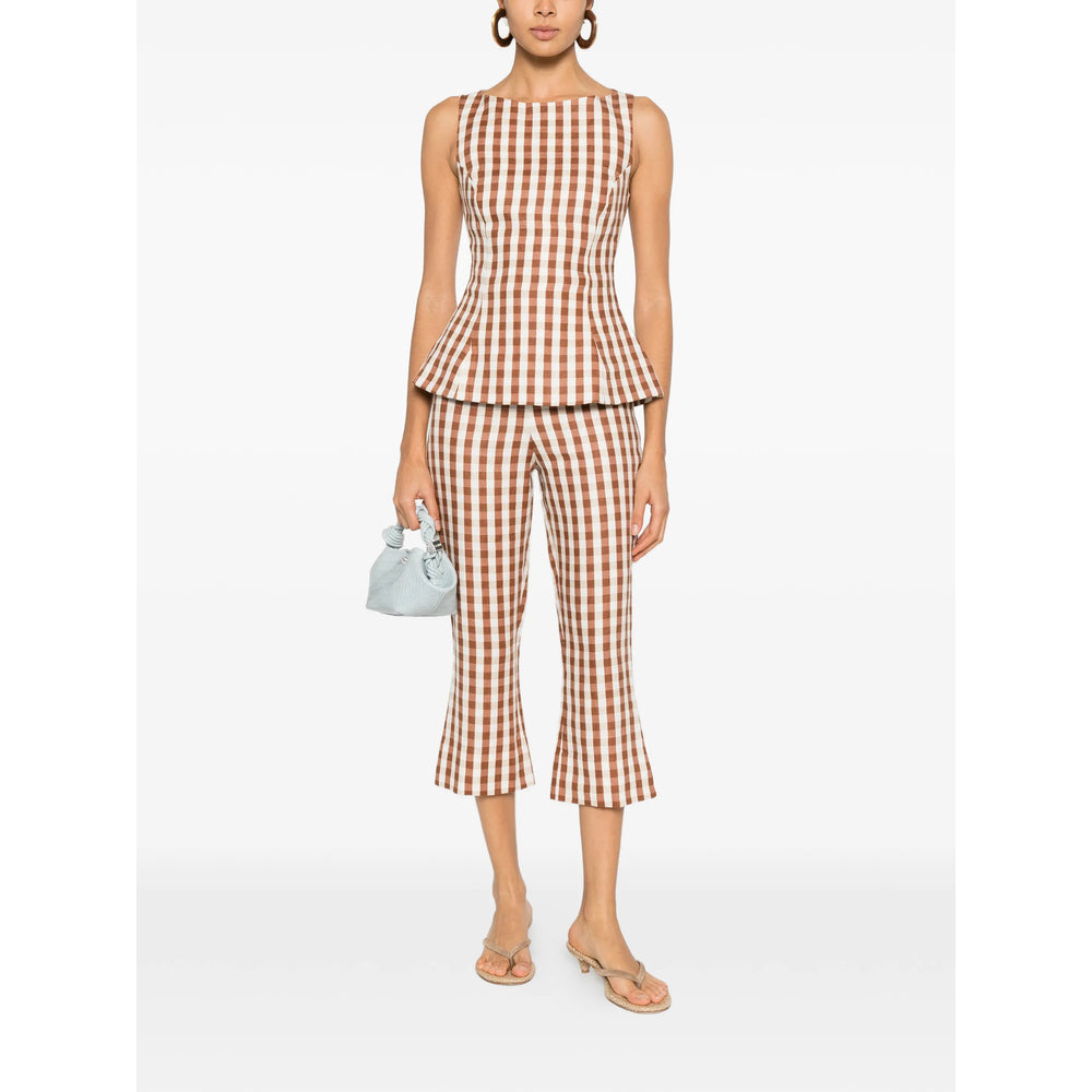 brown and multicolour gingham pattern round neck zip fastening peplum hem