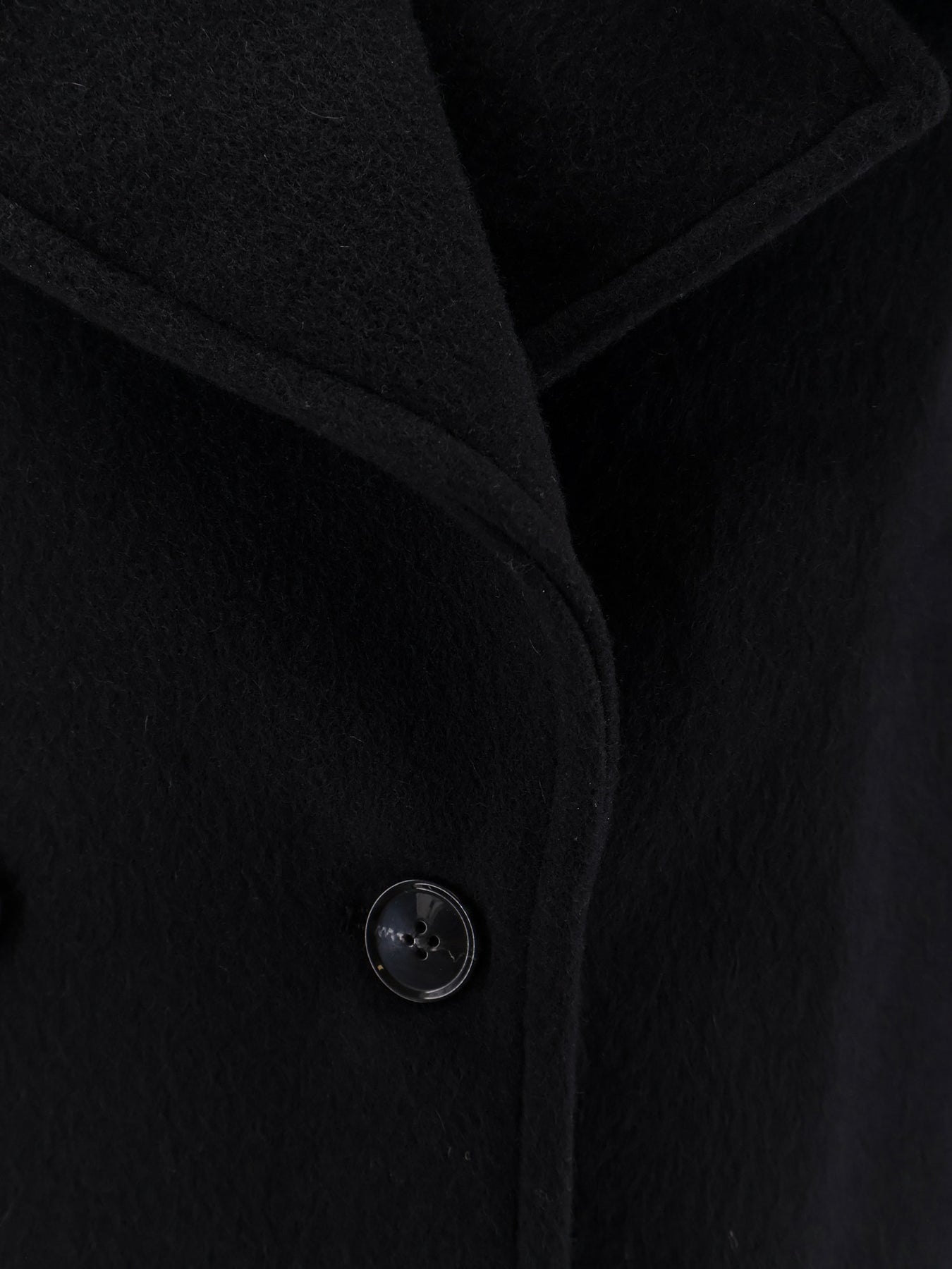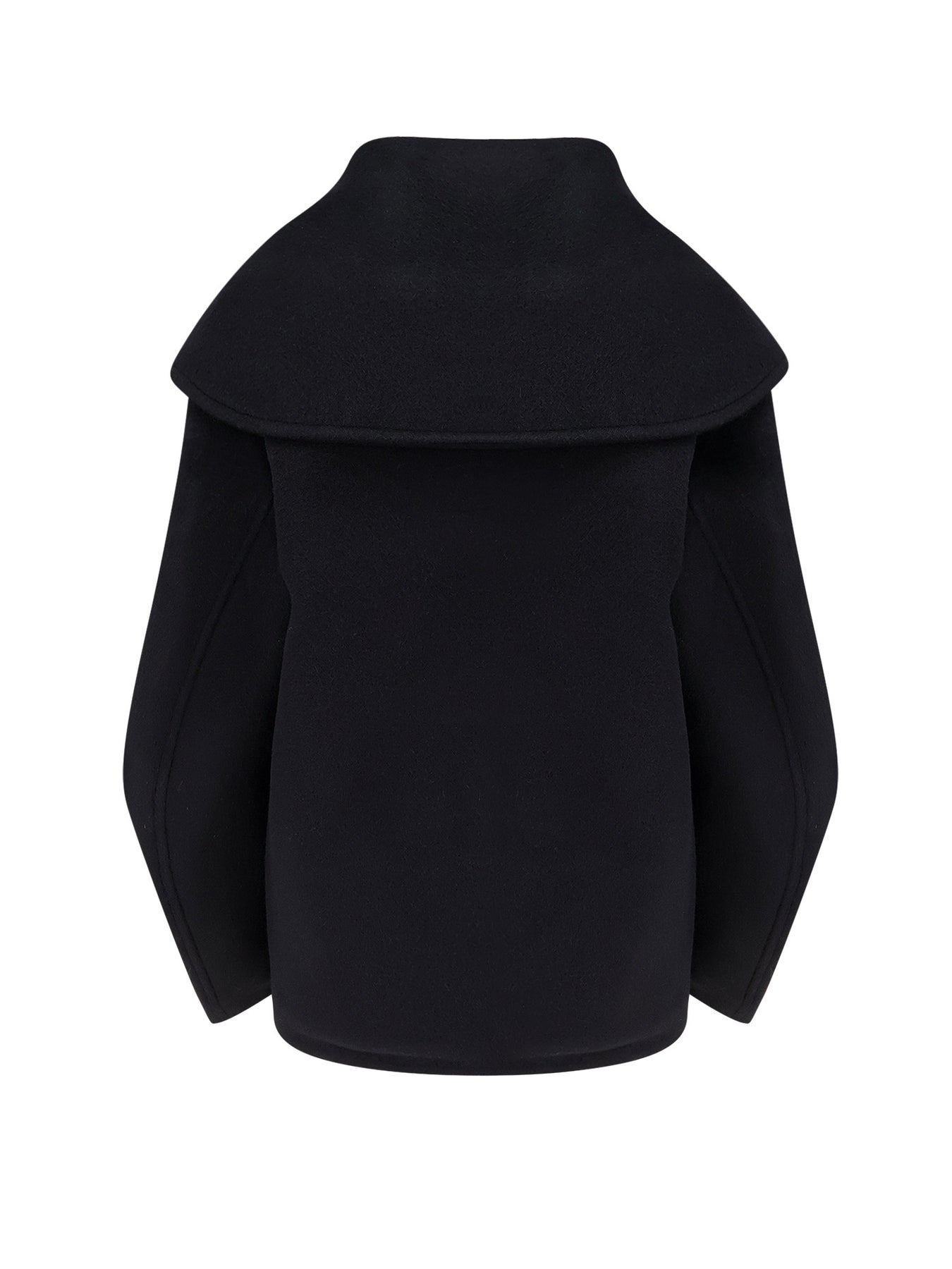 Double-breasted with buttons Wide collar Double front pocket Curved sleeve with pleat detail 100% responsible virgin wool Lining: 100% viscose SKU: IO119133BK999