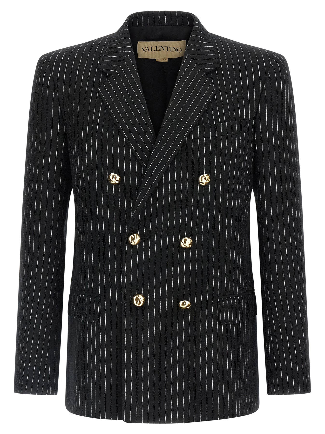'Valentino' pinstripe patterned wool and silk blazer jacket, full canvas construction, double-breasted model with front metal button closure, mirror lapels, breast pocket, flap pockets, padded shoulder strap, cuffs with opening buttonholes, back split, monogram cupro lining.