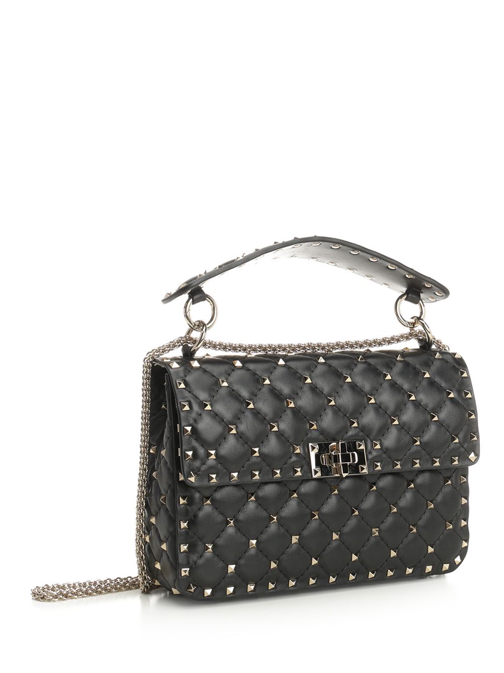 Valentino Garavani "Rockstud Spike" medium chain bag in lambskin nappa leather, with quilted workmanship and decorated with small studs, removable handle and sliding and removable chain, studs and platinum-finish metal parts, flap with twist lock closure, nappa lining, red leather pocket with zip inside