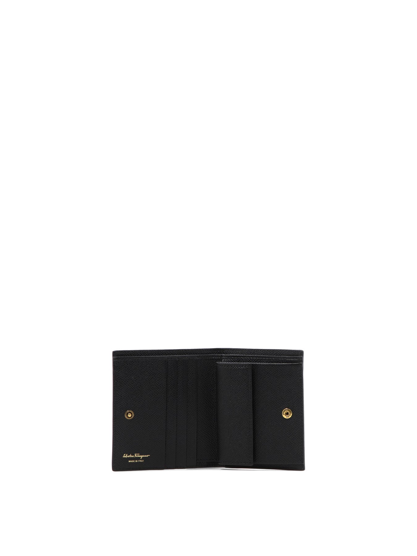 Ferragamo "Gancini" wallet made of regular-grained hammered calfskin. Compact structure with linear contours and slim profile. Metal front element with Gancini clasp in antique gold finish. Hinged opening revealing a main compartment, integrated coin purse and four card slots. Smooth surface inside and precise stitching along edges for smooth construction. || - Hammered calf leather - Gancini buckle with antique gold finish - Four card slots - One main compartment - Interior coin purse - Compact profile