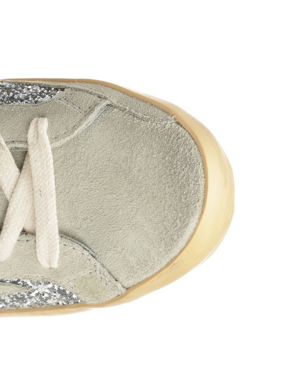 Golden Goose "Super-Star" sneaker with silver glitter and ice-grey suede upper, ice-grey suede star, silver glitter heel tab, ice-grey suede tongue, cream-coloured laces and vintage treatment