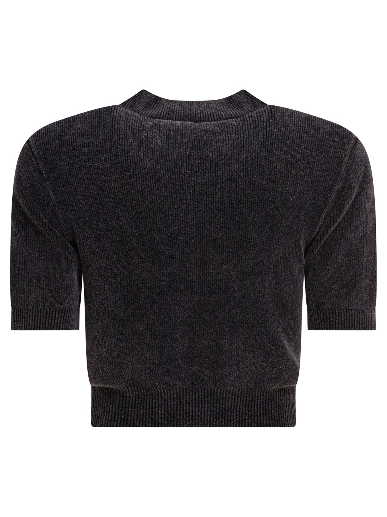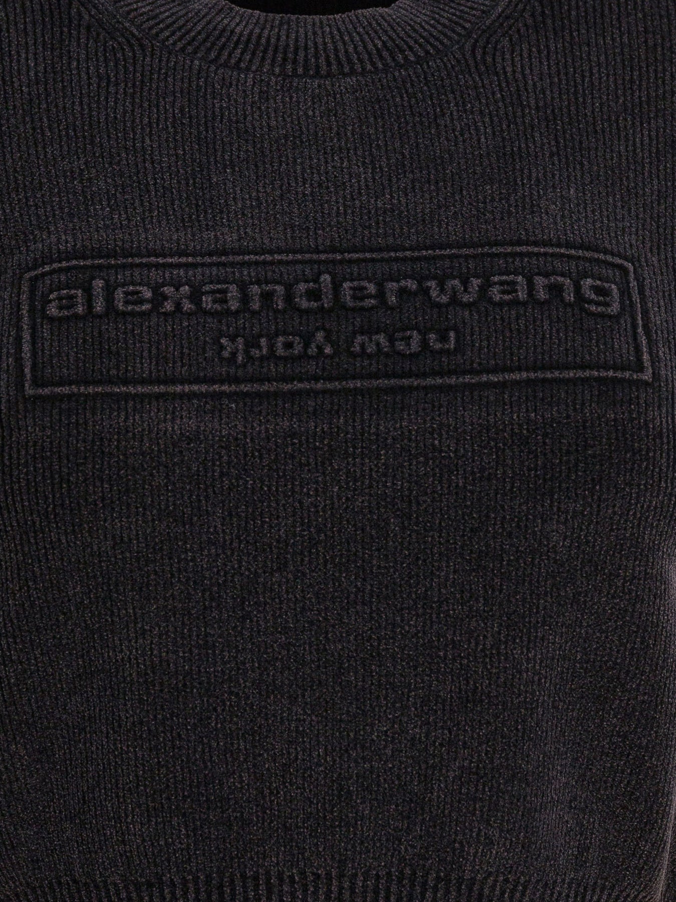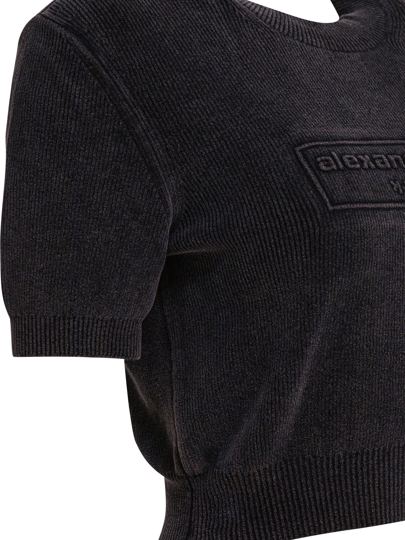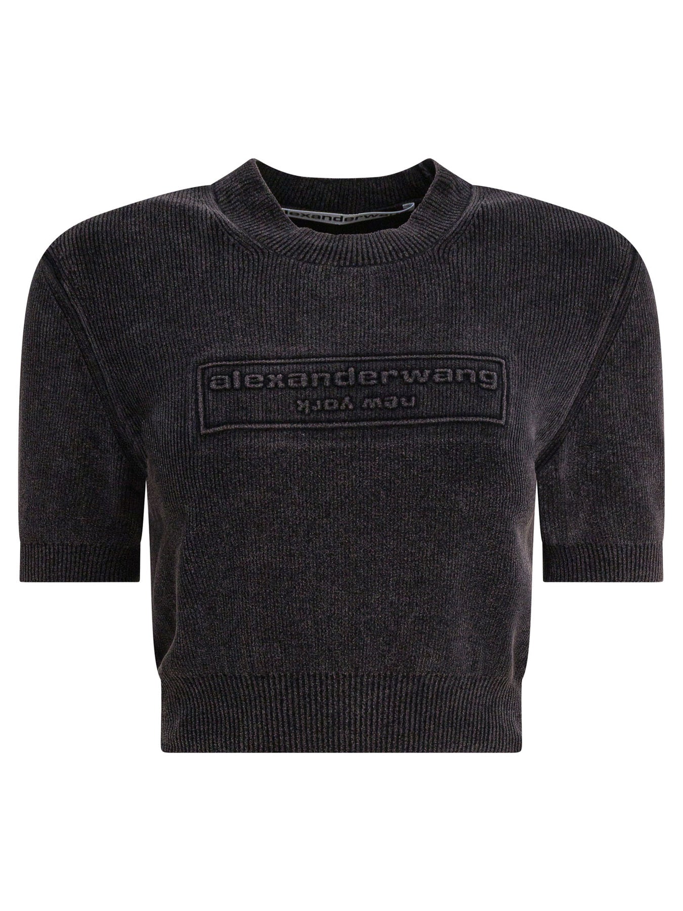 Alexander Wang logo cropped T-shirt made of medium-weight brushed cotton chenille. The surface features a soft texture thanks to the yarn treatment. The short cut reaches to waist level, while the line features a compact structure, complemented by a crew neck and short sleeves. The embossed Alexander Wang logo is positioned centrally. The bottom edge features a ribbed knit that provides stability to the shape. || - Central embossed logo - Short sleeves - Crew neck - Ribbed bottom hem - Brushed cotton chenille construction - Cropped fit