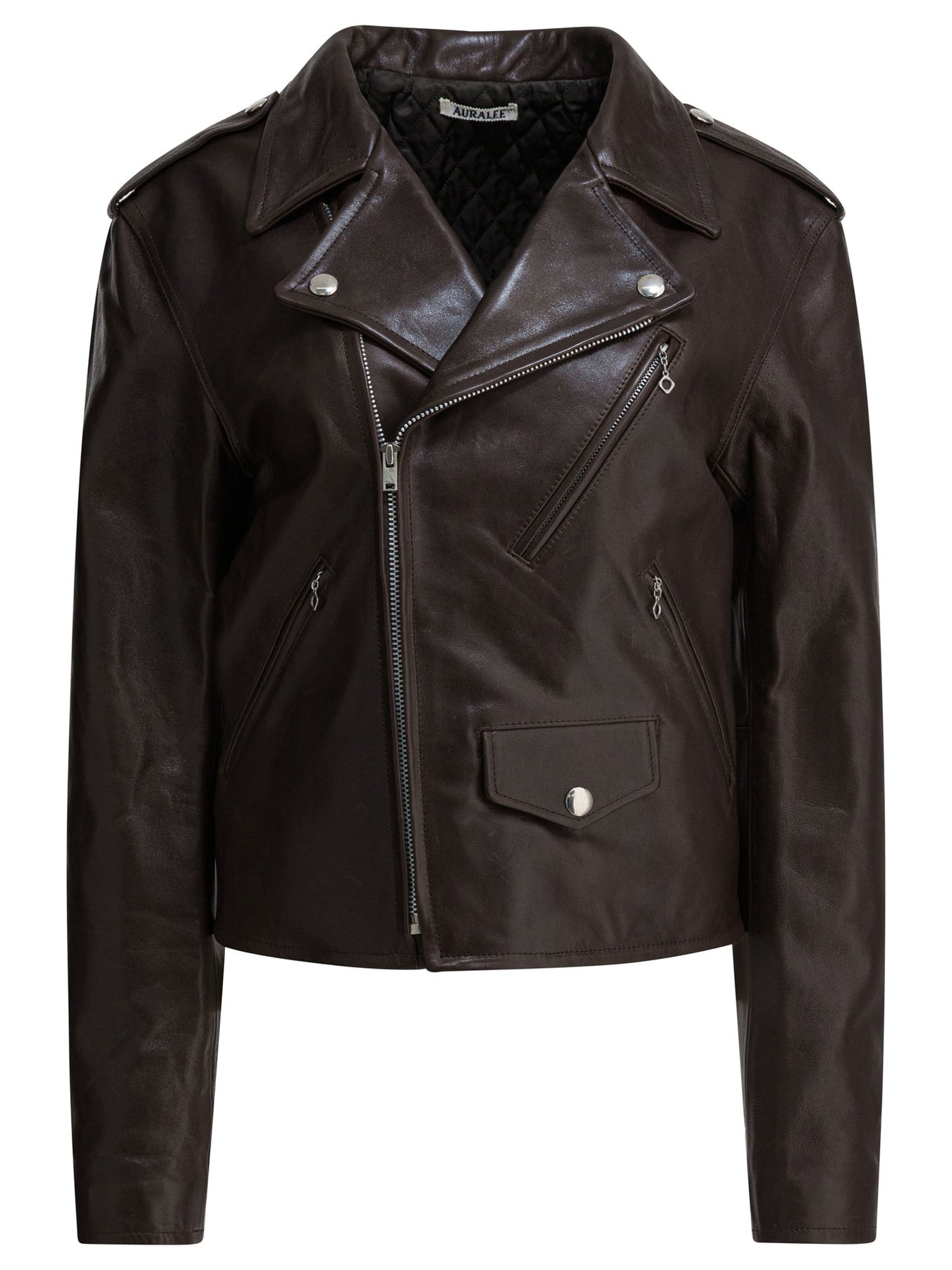 Auralee "Riders" leather jacket made of selected Turkish lambskin, tanned and dyed by vegetable process. The construction provides a compact texture, with natural grain and uniform sheen on the surface. The silhouette follows essential lines, with functional details integrated into the design. The sharp profiles and smooth finish highlight the craftsmanship, keeping the shape stable over time. || - Solid color - Vegetable tanned - Surface with slight color variations - Visible natural grain - Integrated functional details - Regular fit