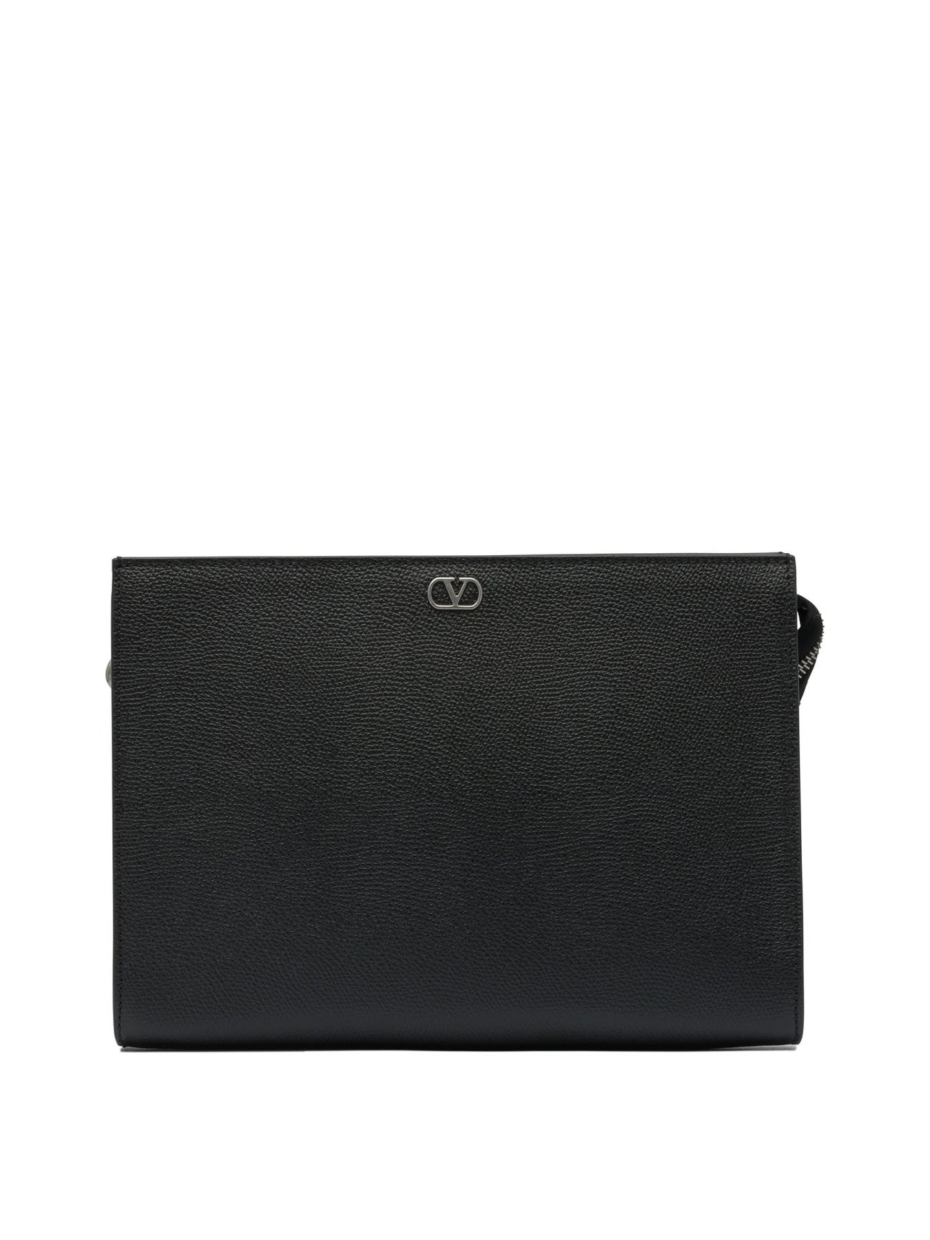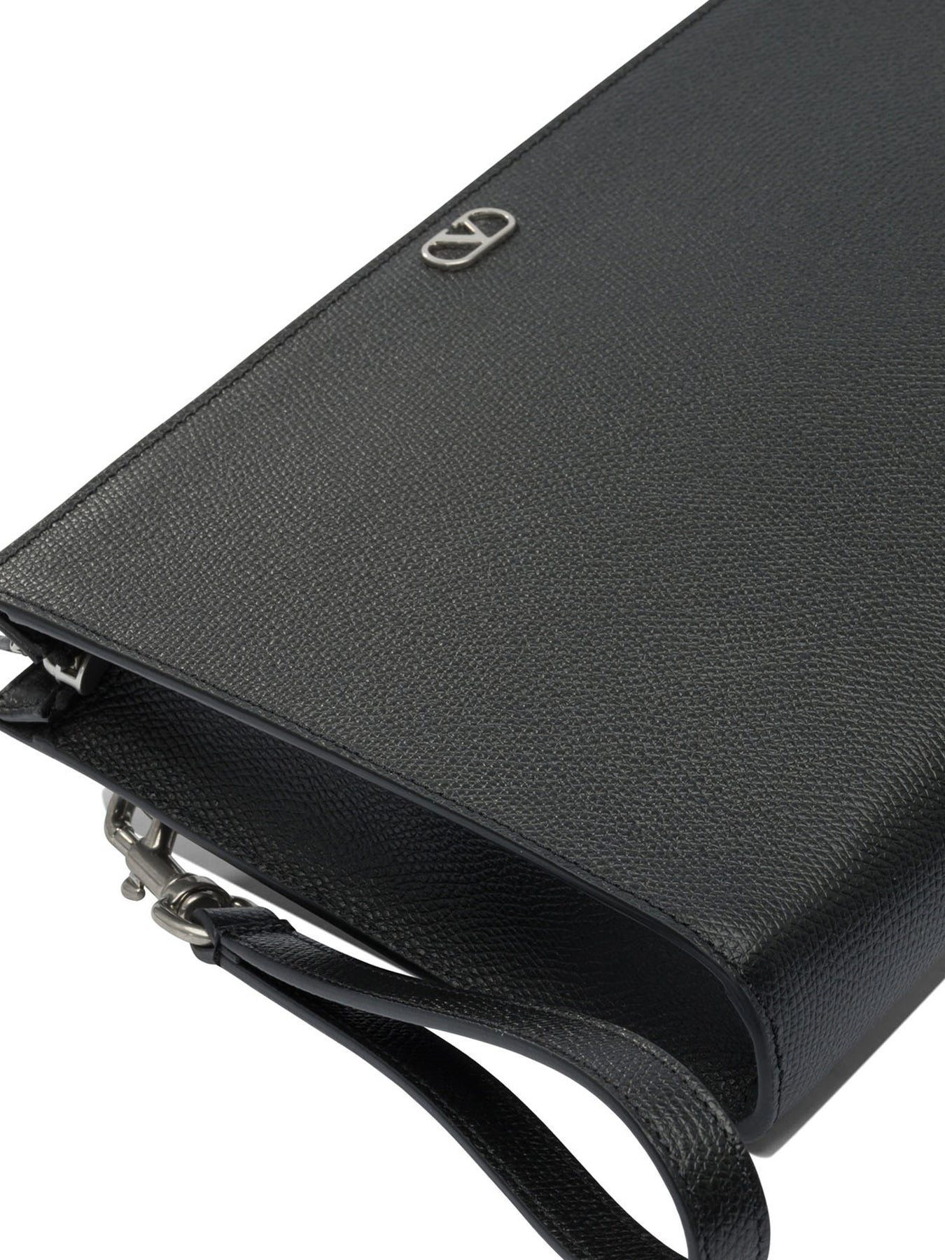 Valentino Garavani's "Vlogo Signature" pouch represents an elegant meeting of craftsmanship and contemporary design. Designed for the man who appreciates balance and functionality, this garnet calfskin pouch is designed to facilitate organization without sacrificing style. The model offers versatile portability, thanks to its removable leather handle, allowing for practical use in both formal and casual settings. An accessory that embodies quiet, versatile elegance suitable for a variety of occasions. || - Valentino Garavani Logo - Signature VLogo accessory antique palladium finish - Zipper closure - Three integrated card slots