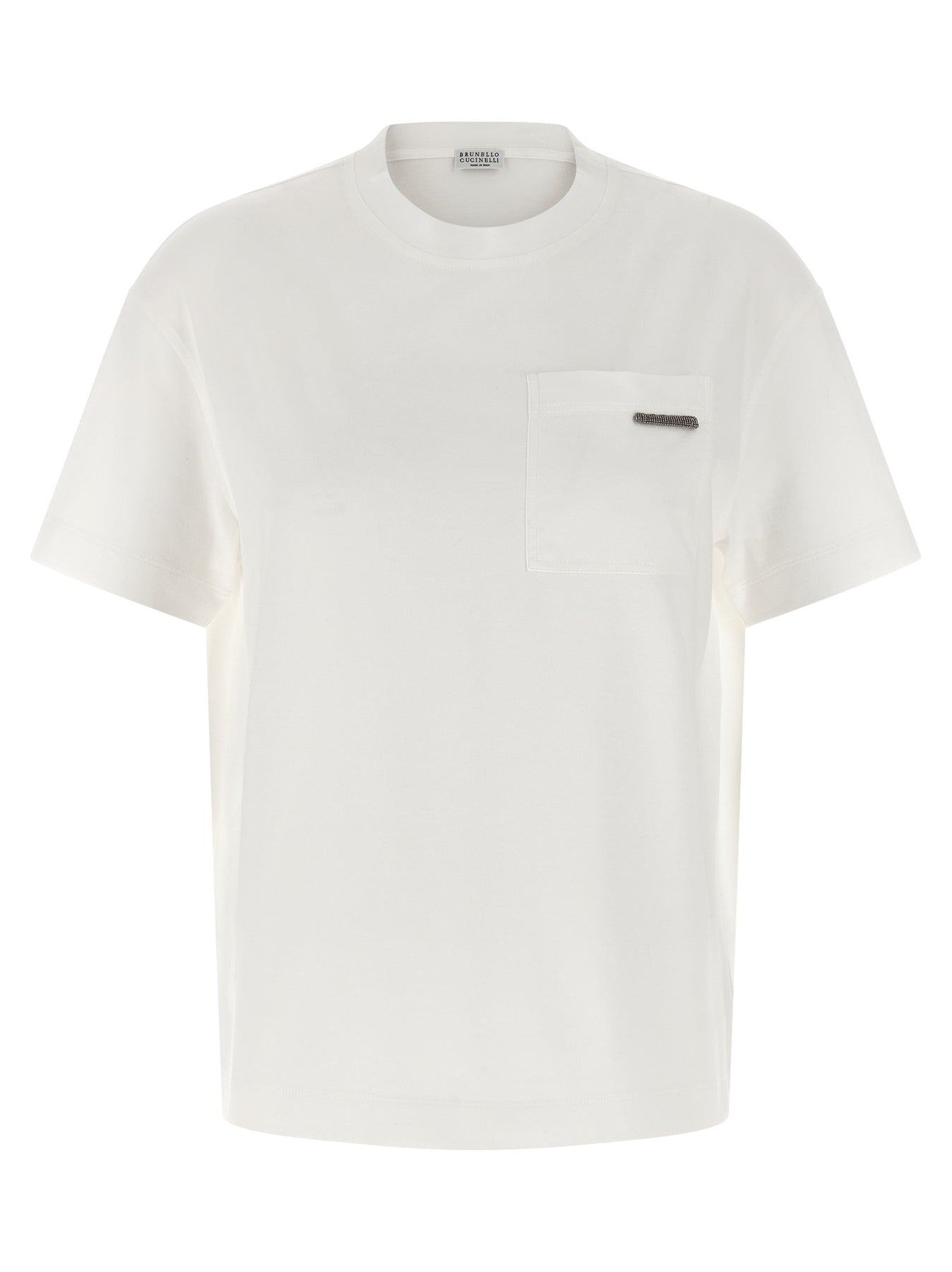 Cotton, crewneck t-shirt, front pocket with Monile detail, and short sleeves.