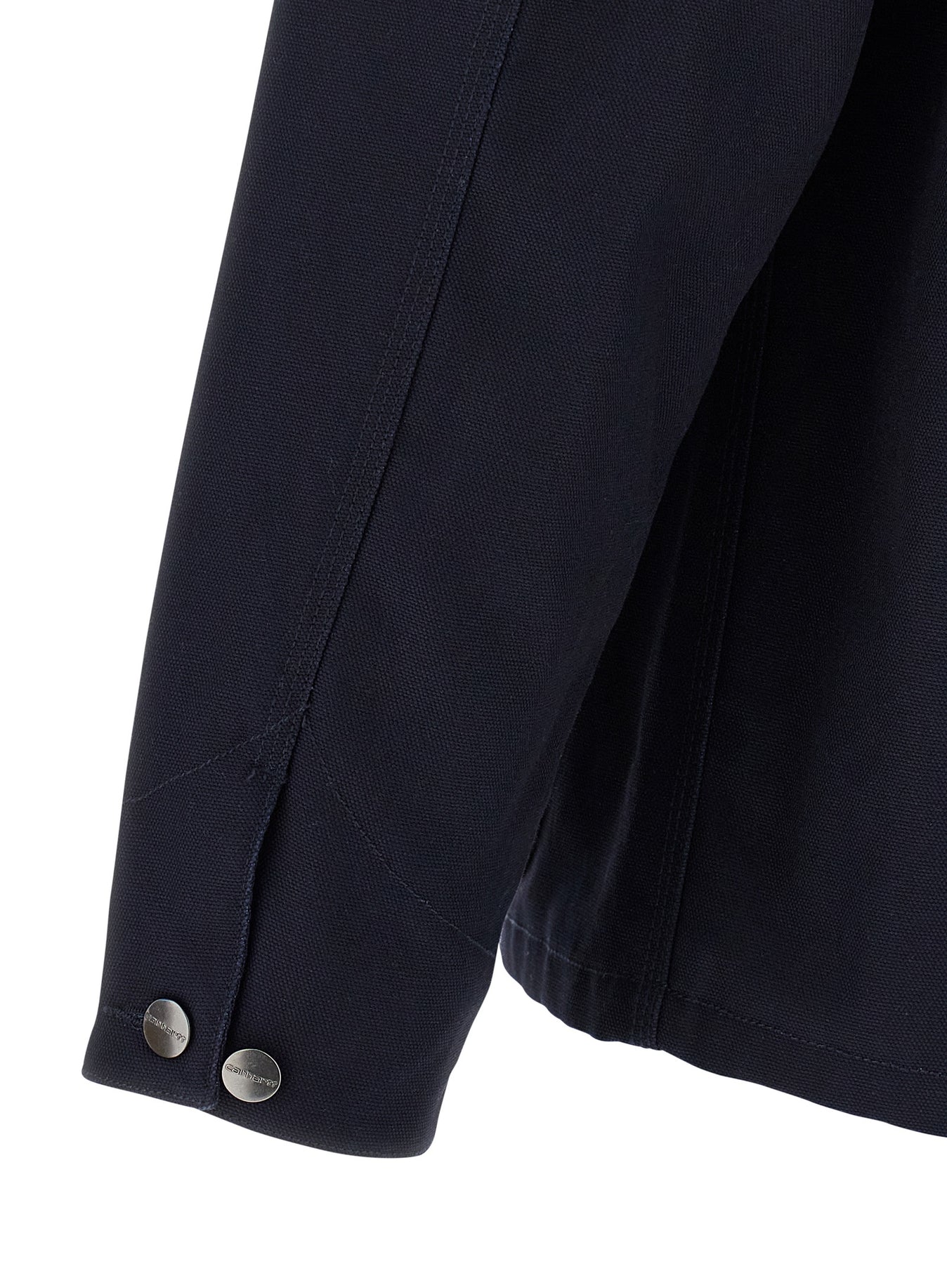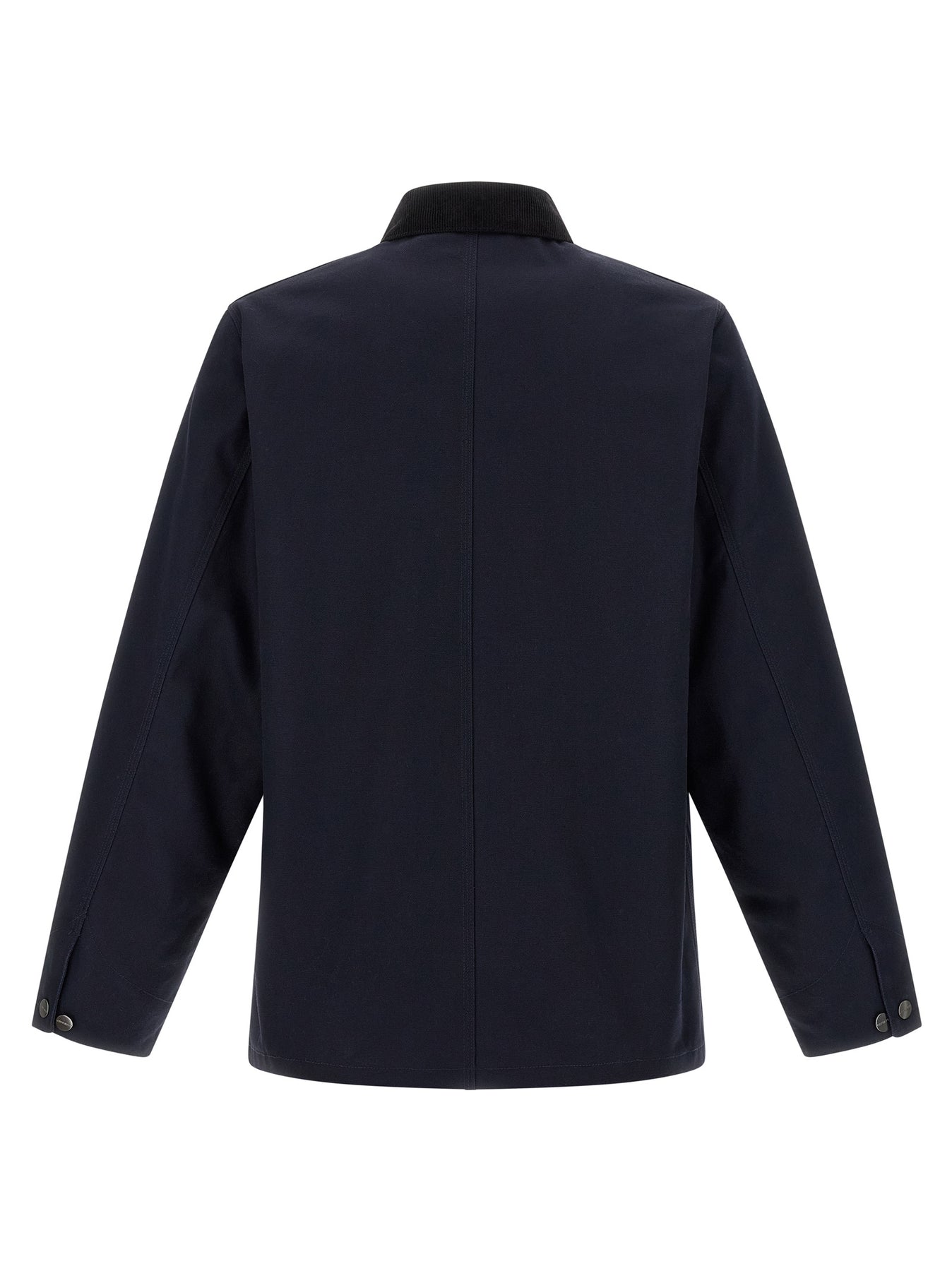 Dearborn canvas 'Michigan' jacket with front logo patch, corduroy collar, wool lining, pockets, button closure, long cuffed sleeves.