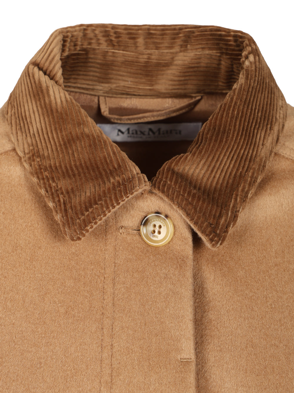 Short jacket in lightweight, water-repellent baby camel drap by Max Mara, with a straight fit and matching belt with pull buckle, 500-line cotton velvet shirt collar, set-in sleeves with cuff and side button, hidden front fastening, internal left pocket and leather logo loop on the back of the neck.