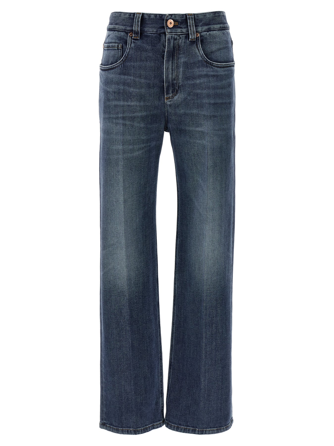 'Contemporary Loose' lightweight stonewashed cotton denim jeans with used effect wide and straight leg, front zip and button closure, five pockets, Monile detail and leather logo label at the back.
