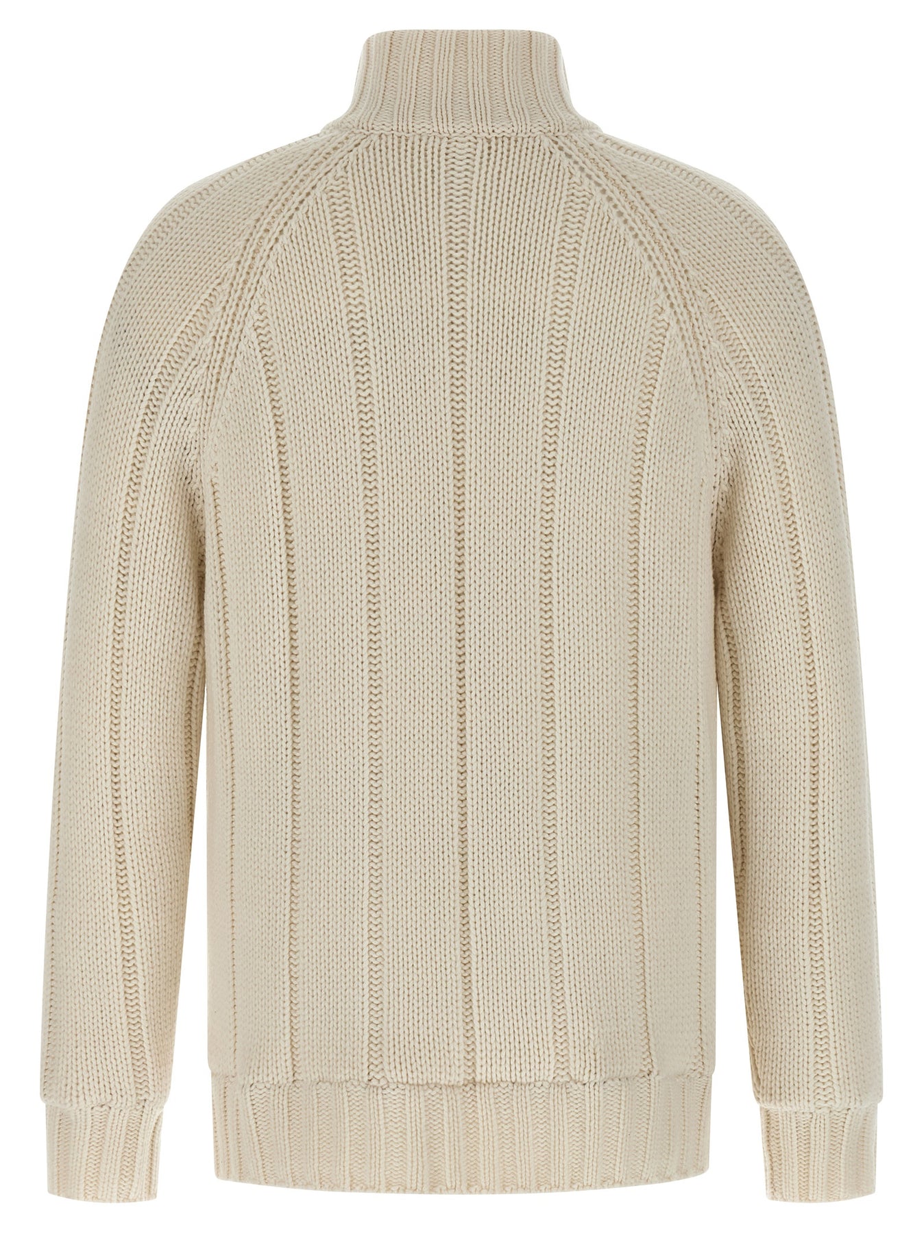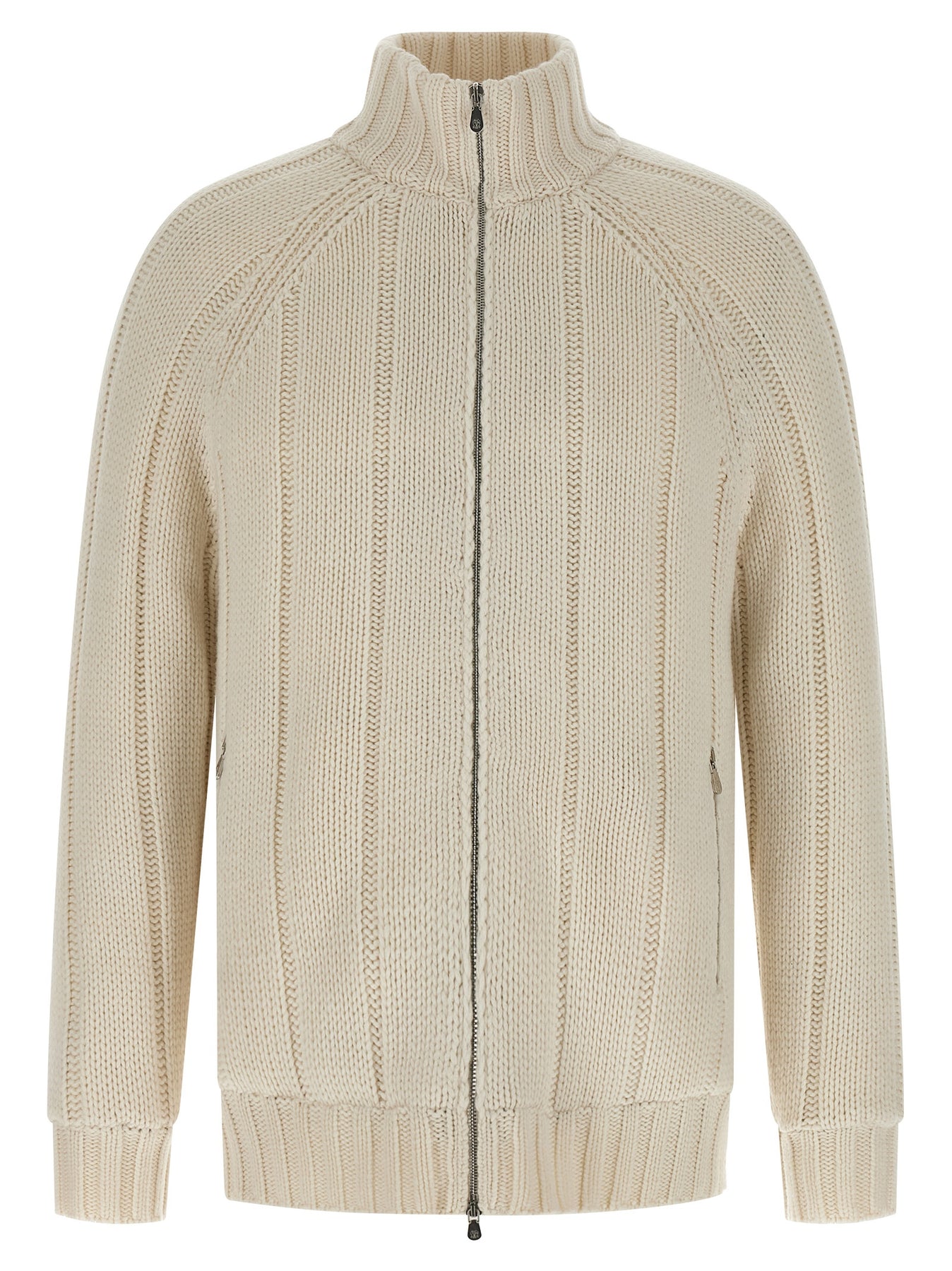 Cashmere knit down jacket, high neck cardigan style, zip closure, side pockets, long cuffed sleeves.