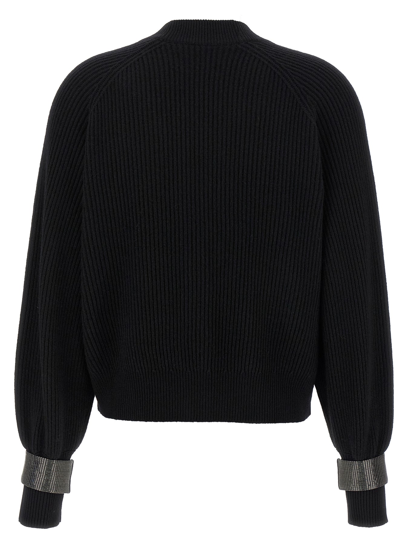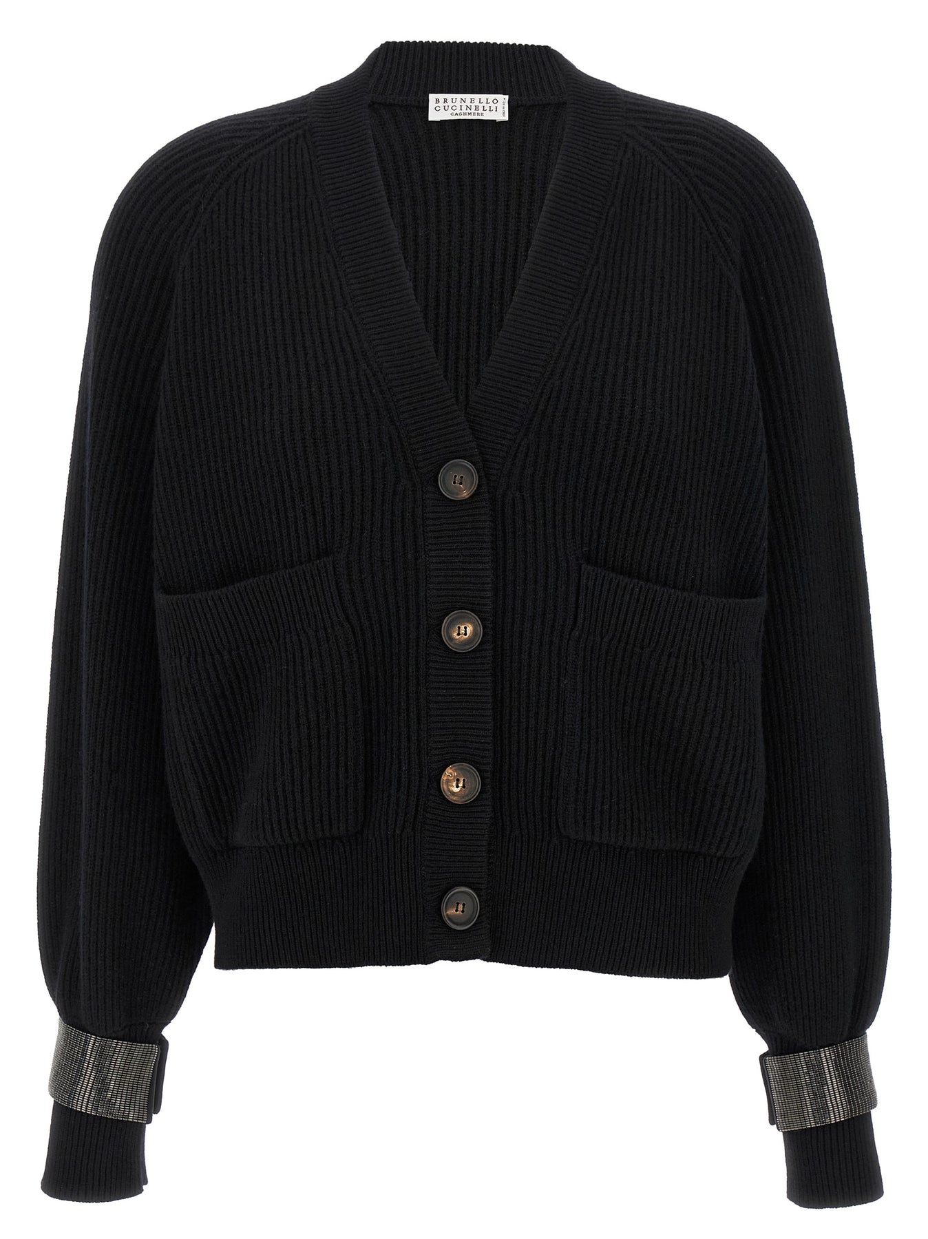 English rib cashmere cardigan with long sleeves with double layer cuffs, removable jewel cuffs, V-neck, front button closure, pockets.
