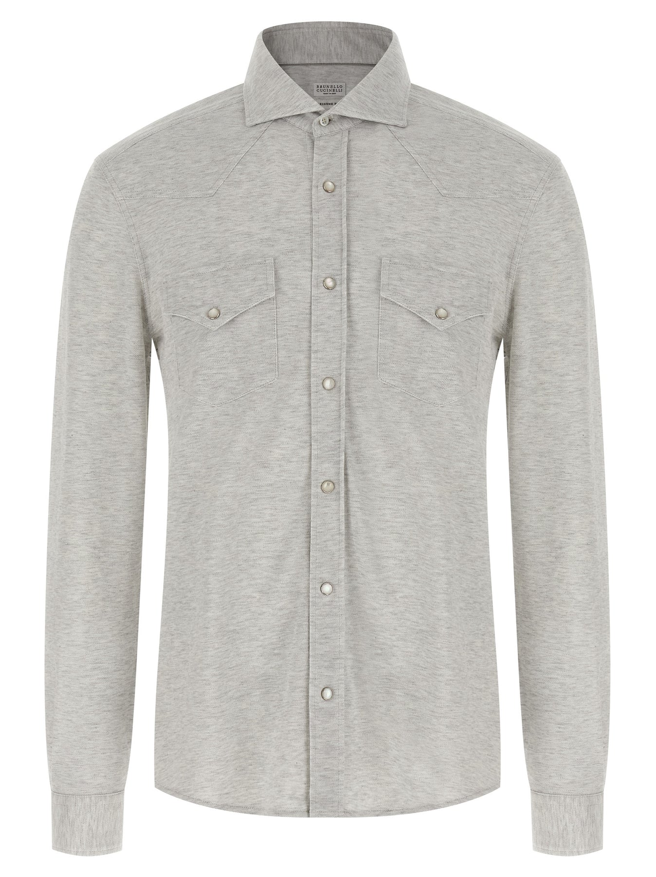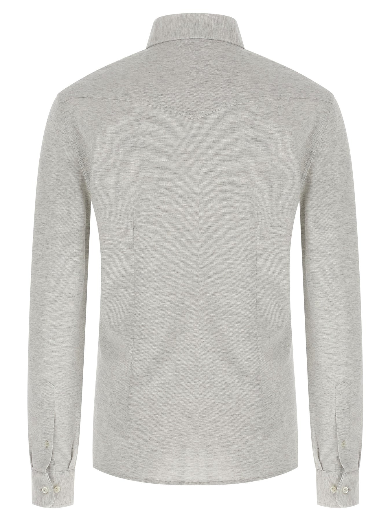 Cotton piqué shirt with front snap button closure, pockets, long cuffed sleeves.