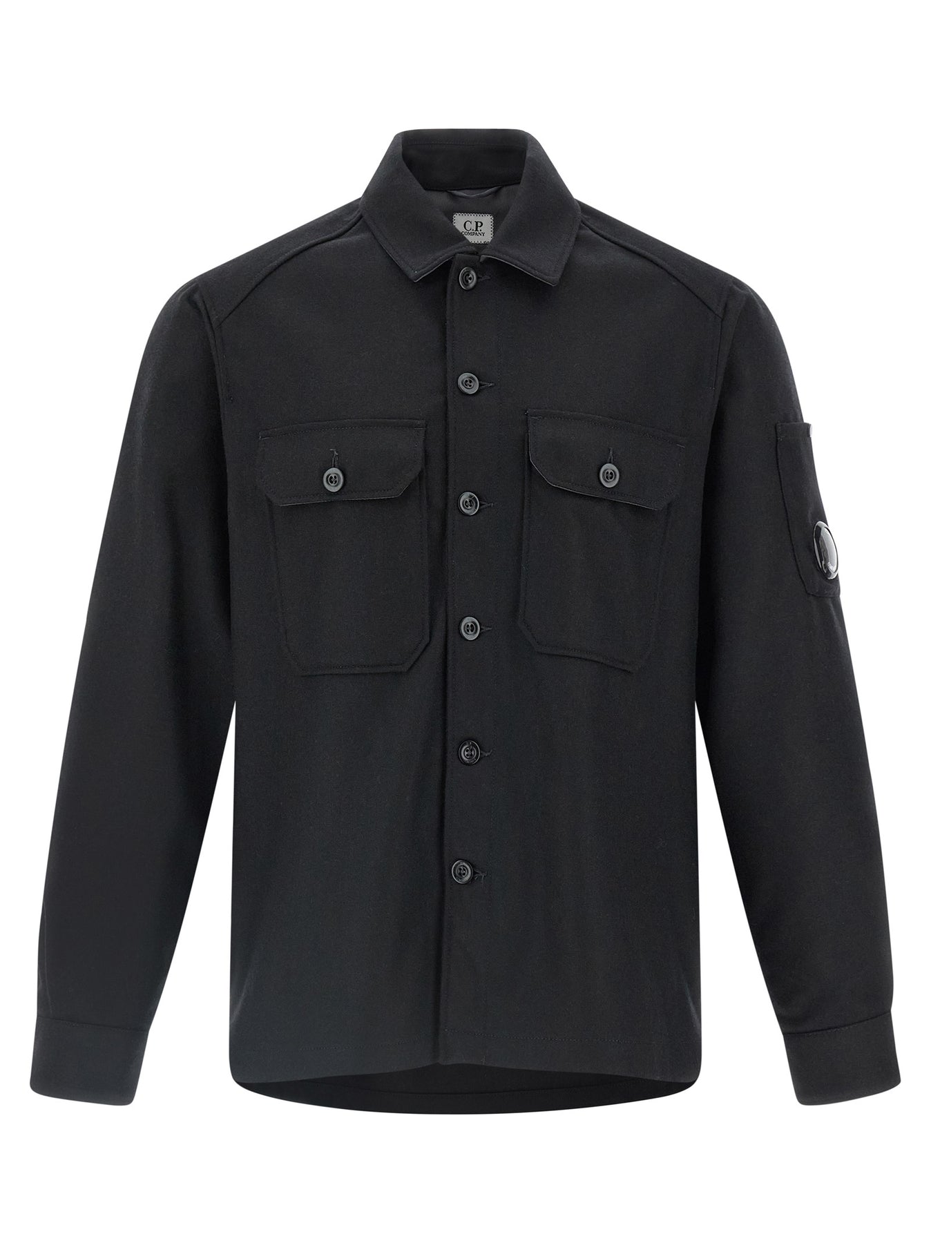Wool overshirt, unlined, shirt collar, front pockets, side slits, button closure, side logo, long sleeves with cuffs.