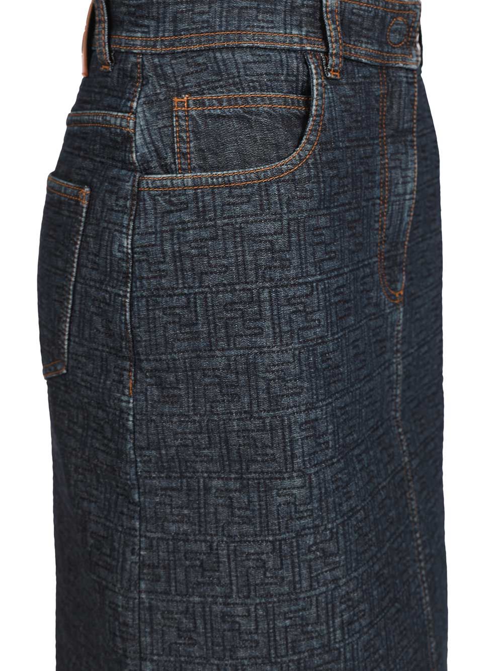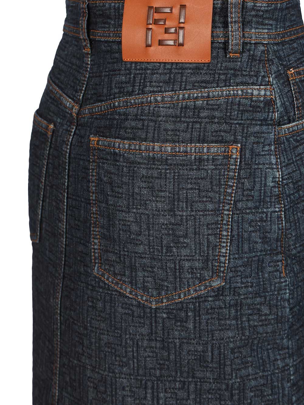Fendi FF denim mini skirt, with a flared line, 5 pockets, belt loops at the waist, covered zip and hidden snap button fastening, contrasting tobacco-coloured stitching.