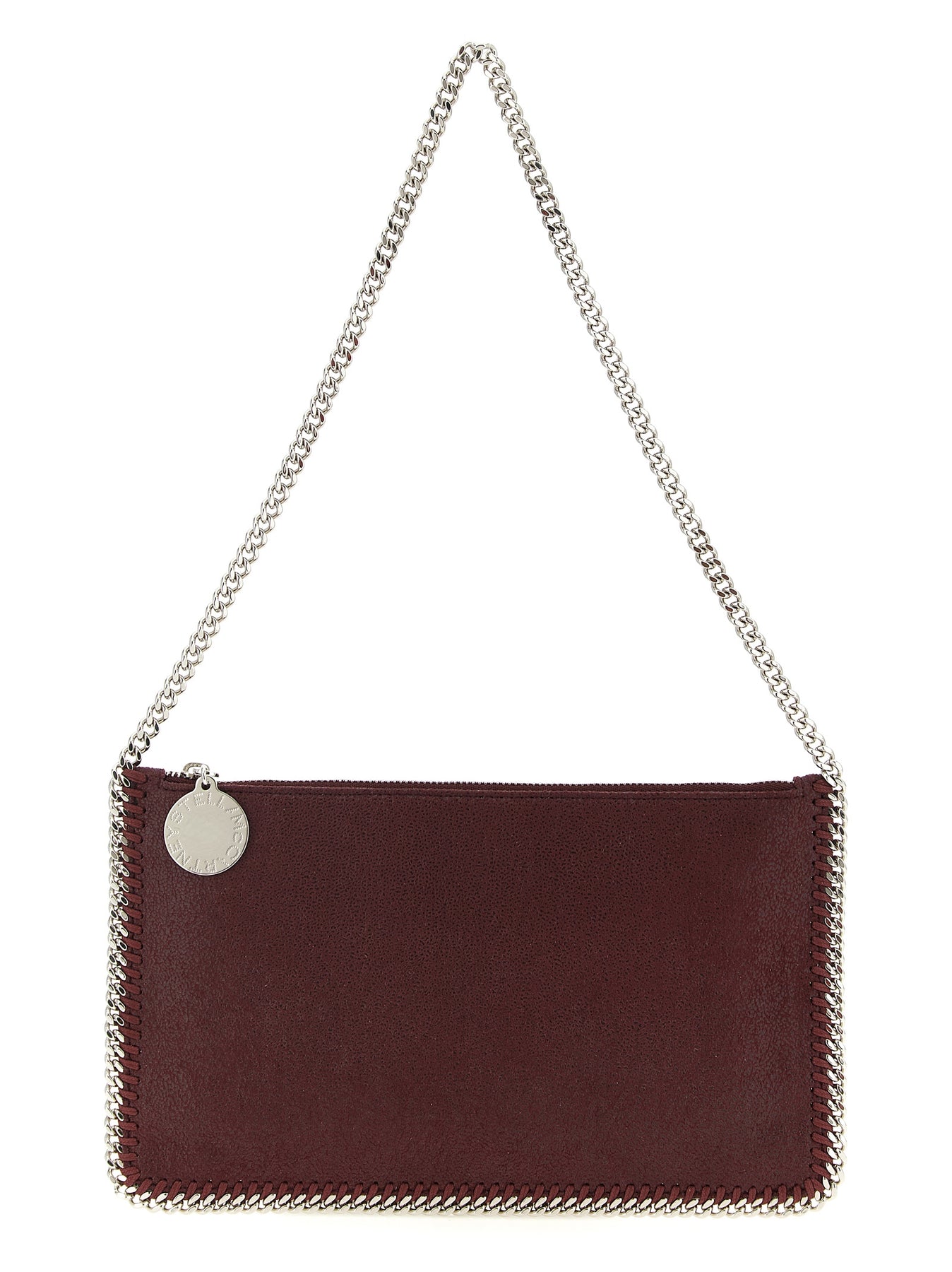 'Falabella' clutch bag in Shaggy Deer vegan garnet fabric with chain piping, top zip closure, chain handle, medallion charm with engraved logo. SUSTAINABLE: Products that do not use leather respecting cruelty free ethics.
