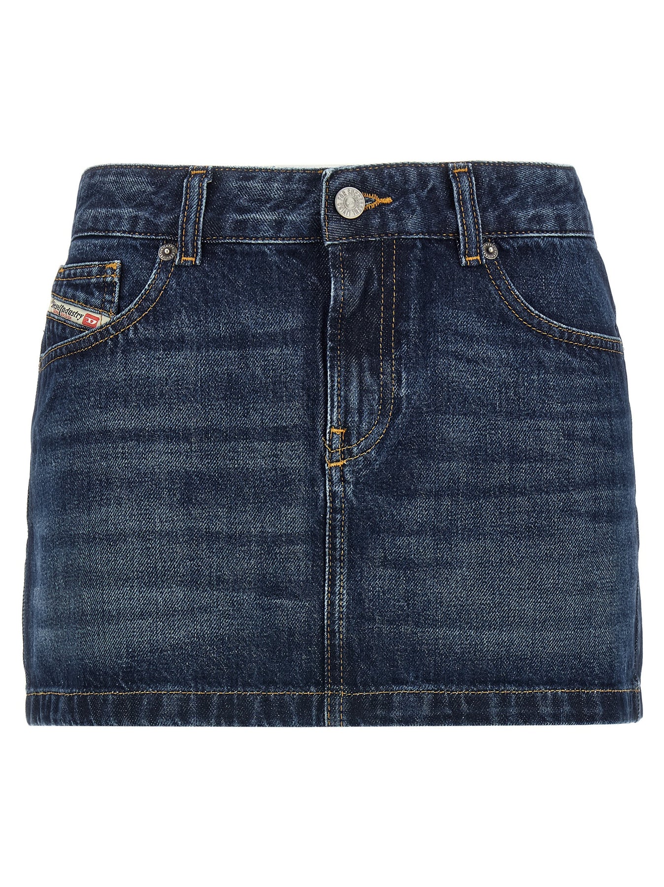 'De-Ron' low-waisted mini skirt in cotton denim with front zip and button closure, five pockets, back logo tag.