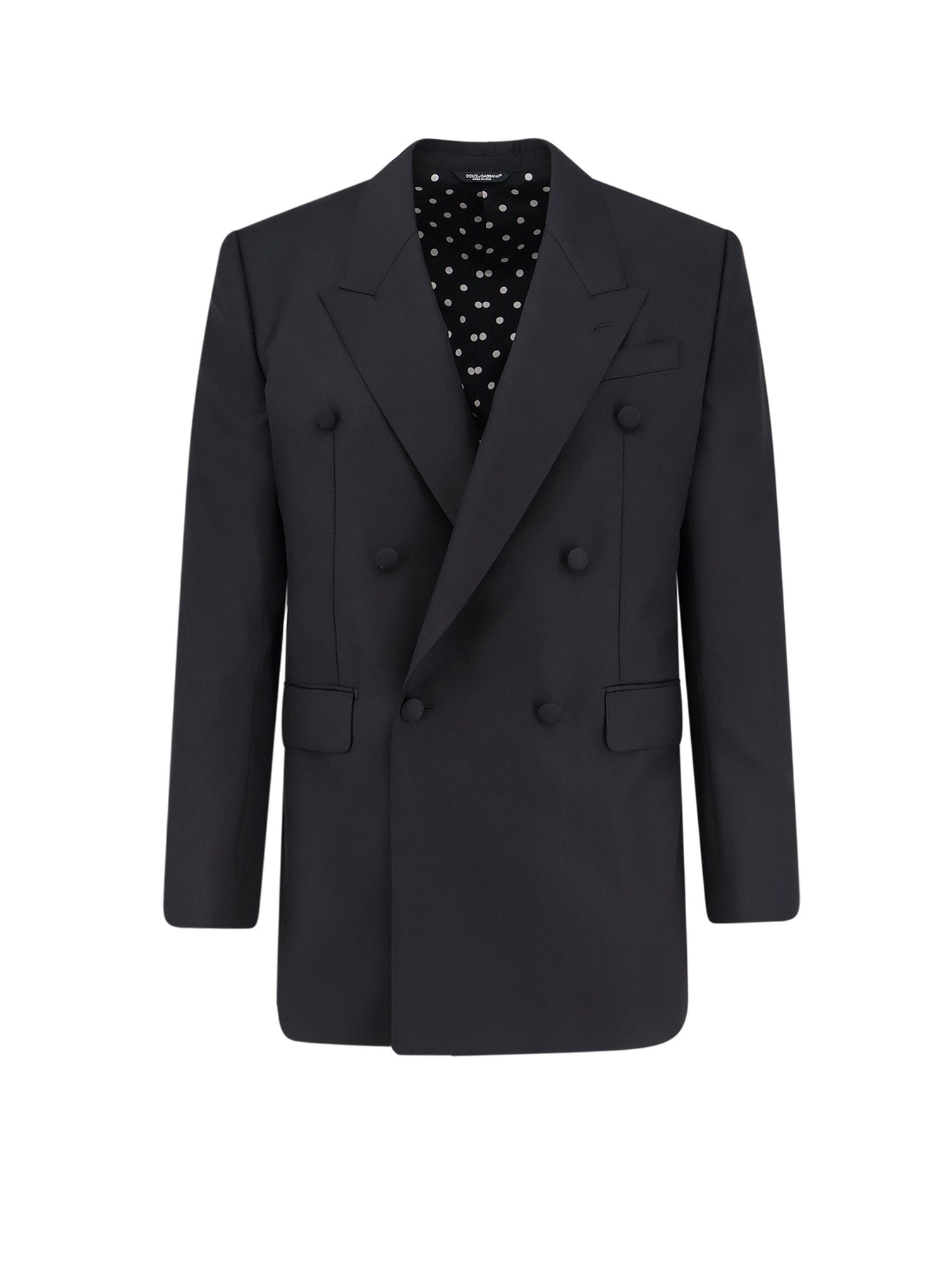 Double-breasted with covered buttons Peak lapel with stitched edges Front flap pockets Polka dot silk lining Made in Italy 100% virgin wool SKU: G2VN8TGK048N0000