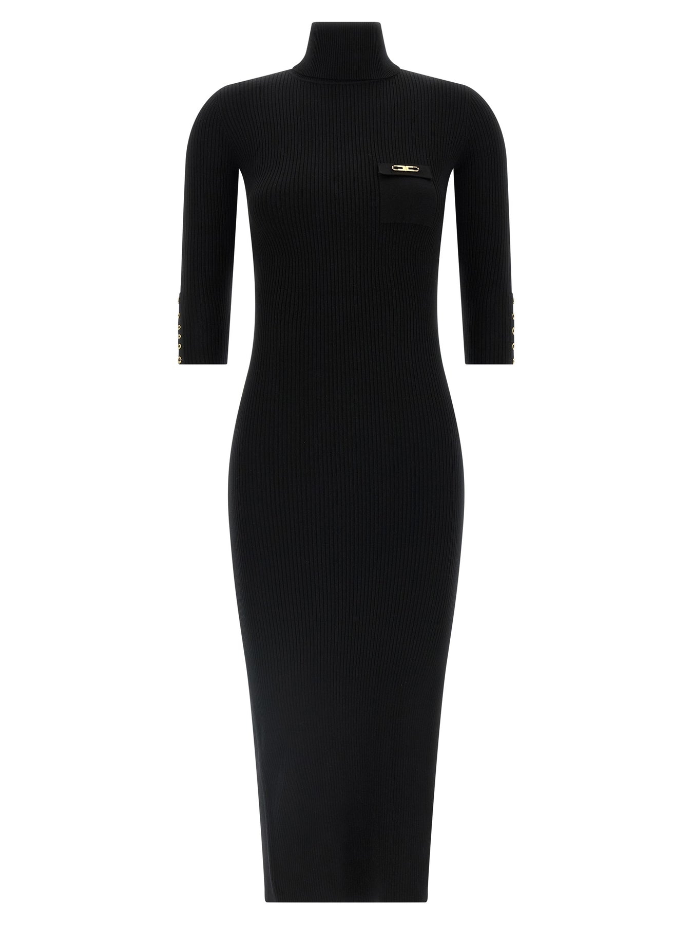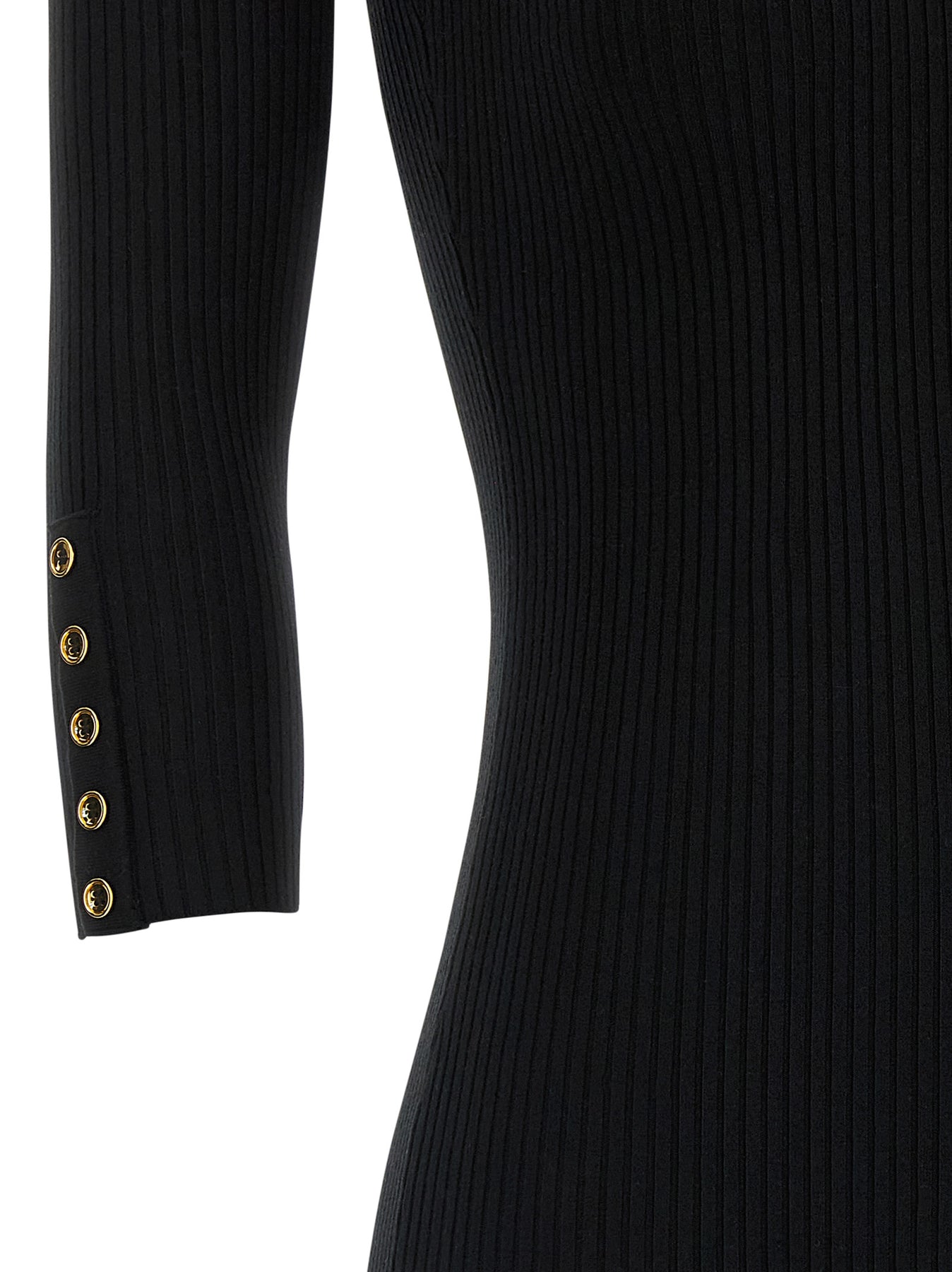 Ribbed knit midi dress, high neck, gold front logo patch, 3/4 sleeves with gold button detail.