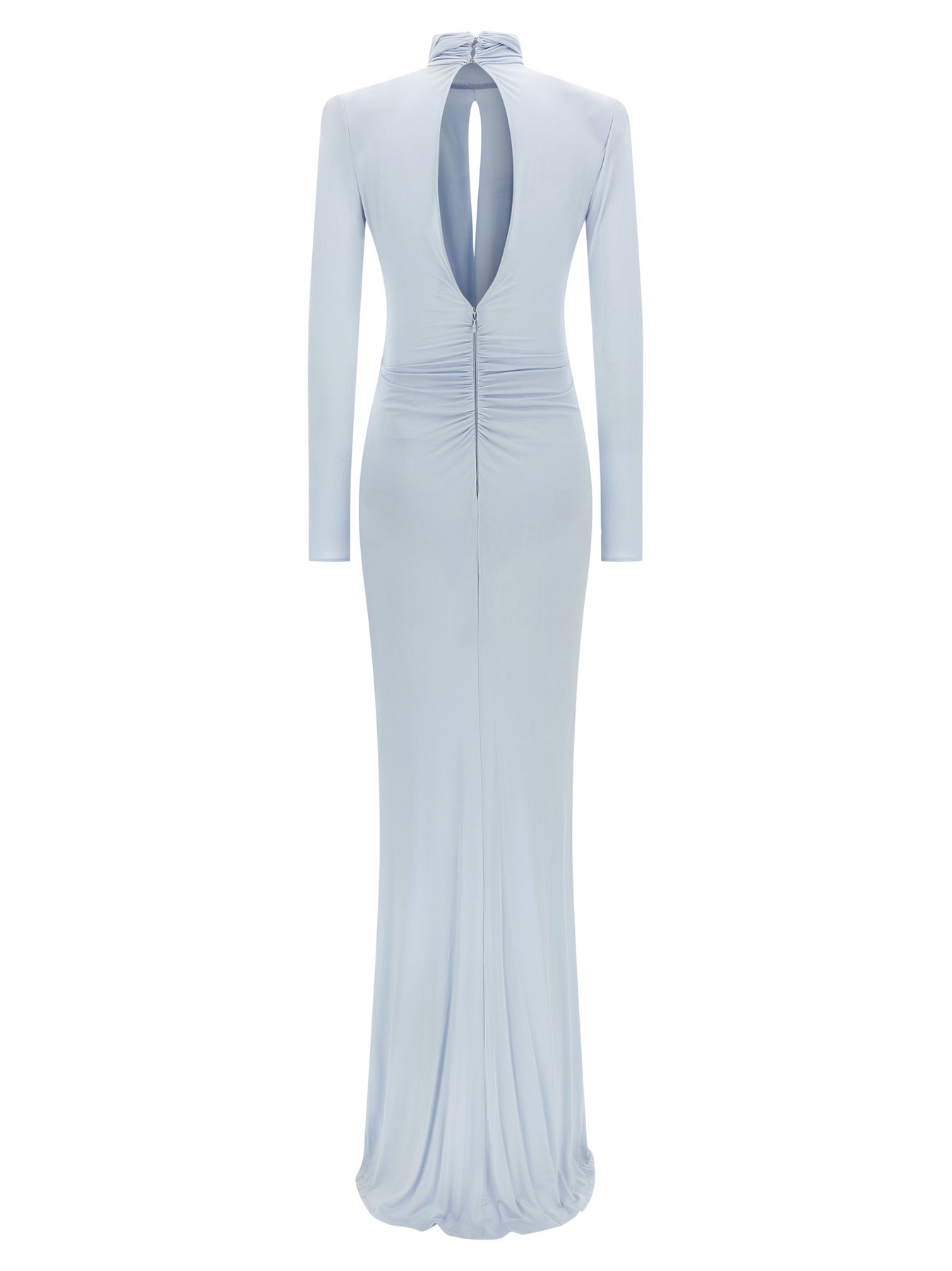 Long 'Red Carpet' dress in silk-effect stretch fabric, high neck and button closure, cut out detail at the source and back, front metal buckle, deep central split, removable padded shoulders, inner briefs with zip and hooks, long sleeves.
