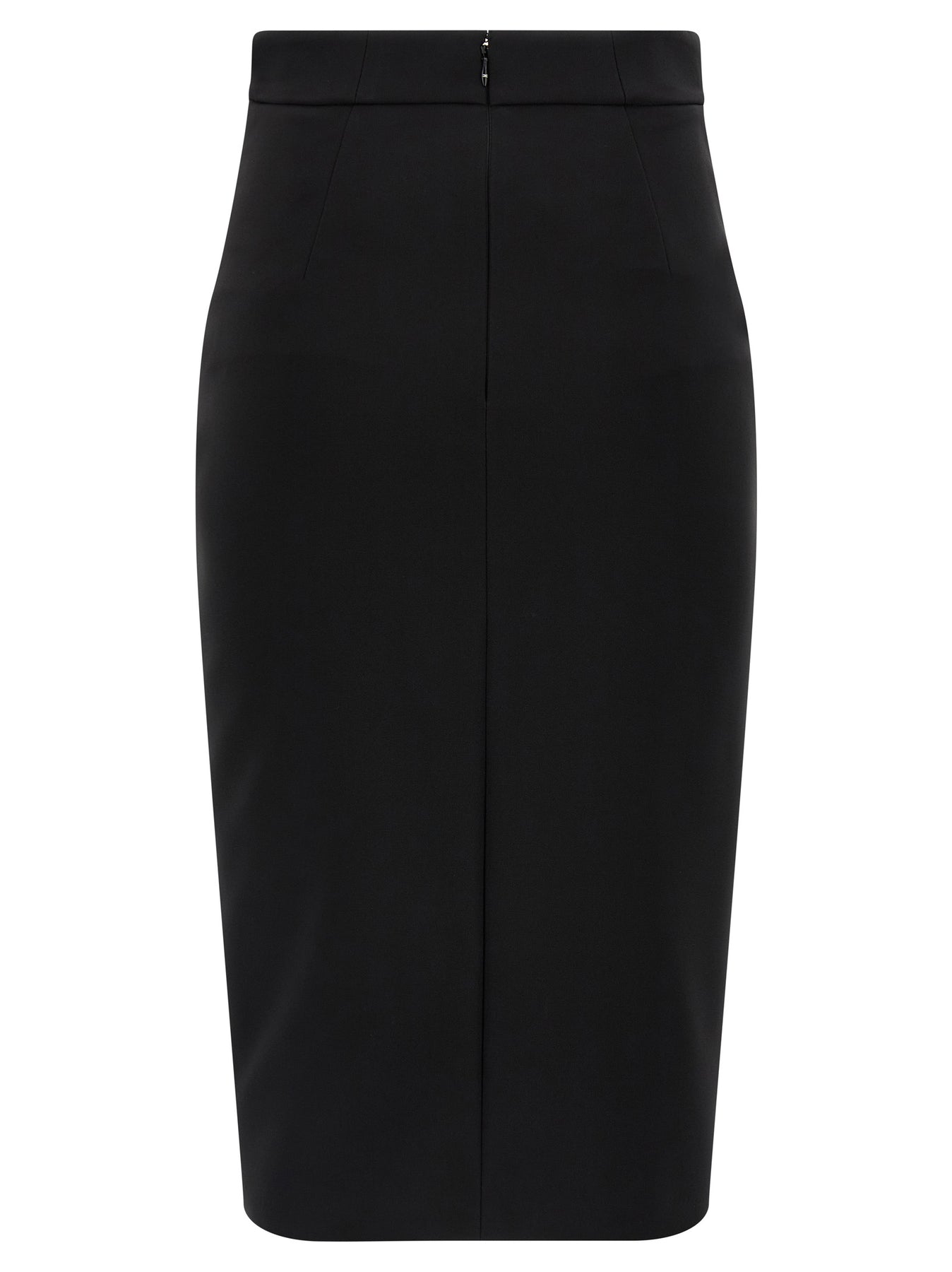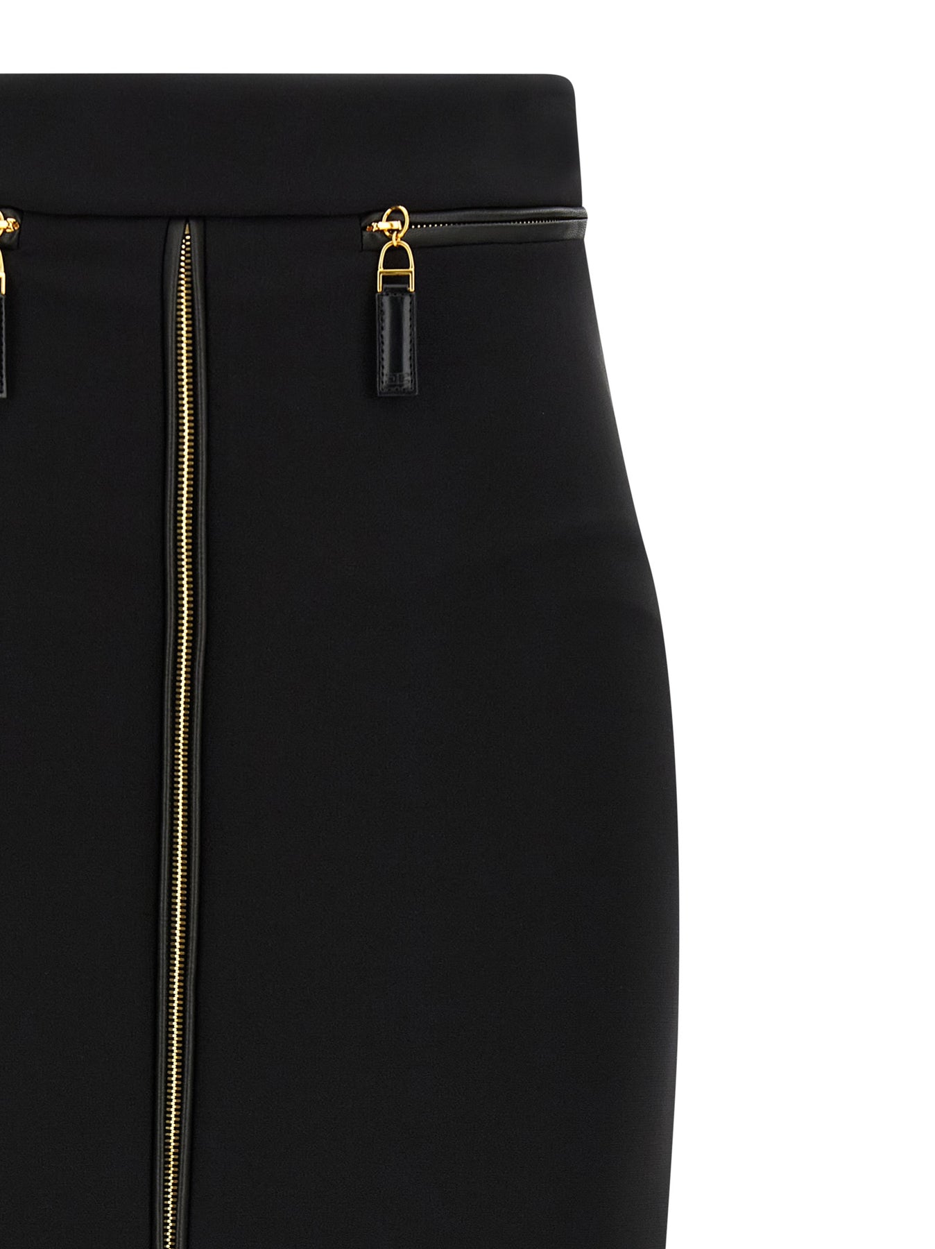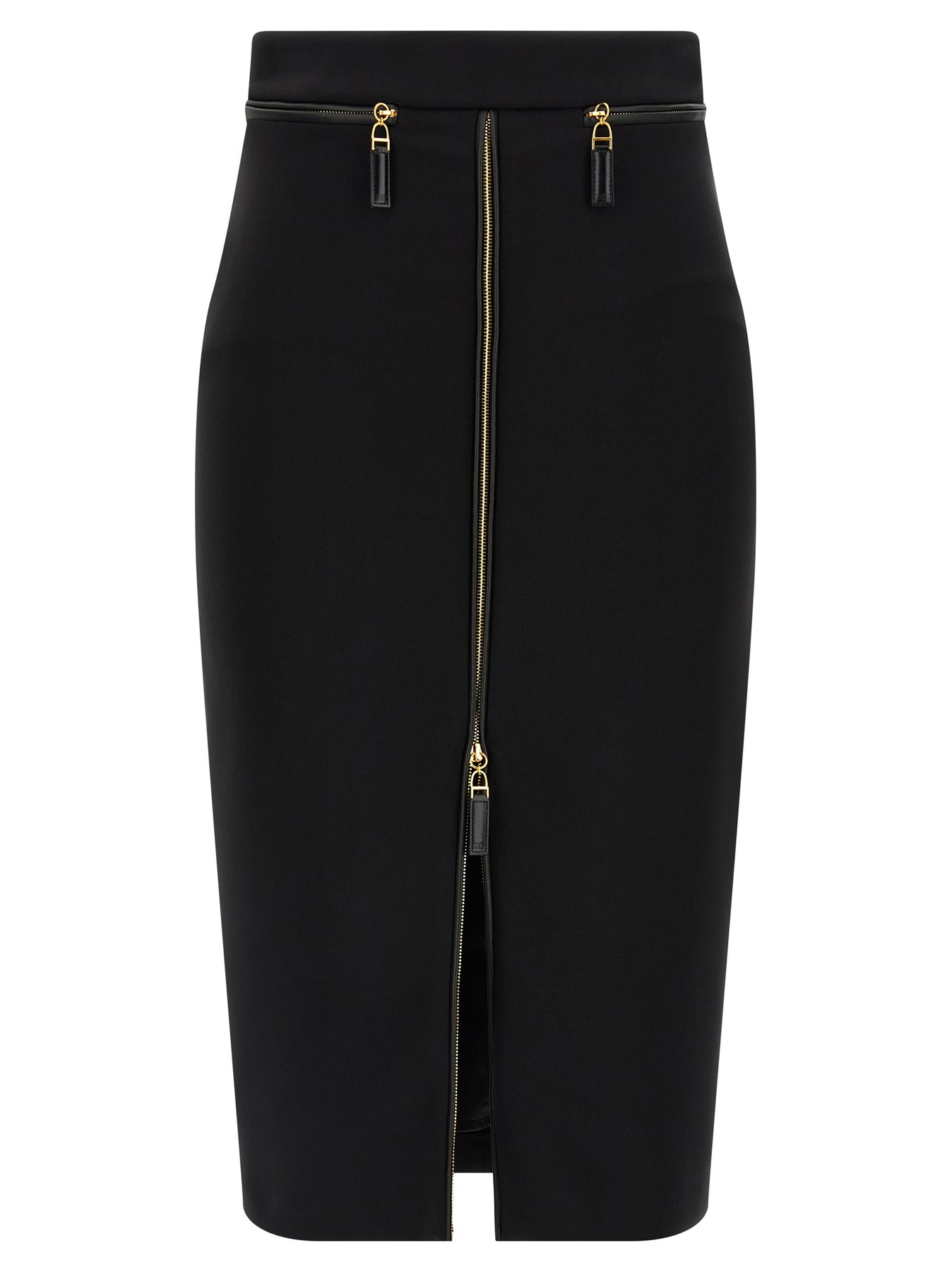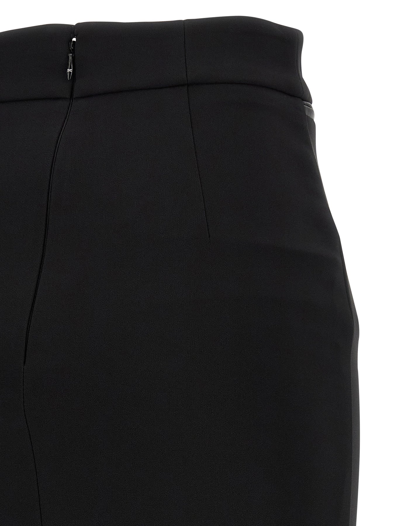 Light crêpe midi skirt, longuette model, high waist, front and back zip closure, front trompe l'oeil pockets with leather-effect fabric details, monogram satin lining.