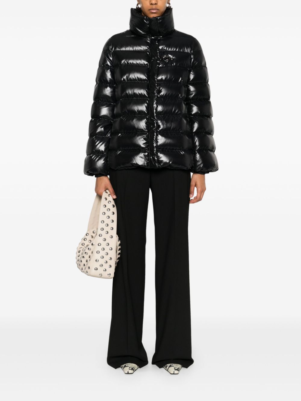 black shell glossy finish padded design goose down-feather filling front hook and eye fastening front two-way zip fastening concealed front press-stud fastening stand-up collar long sleeves layered elasticated cuffs two side zip-fastening pockets full lining straight hem