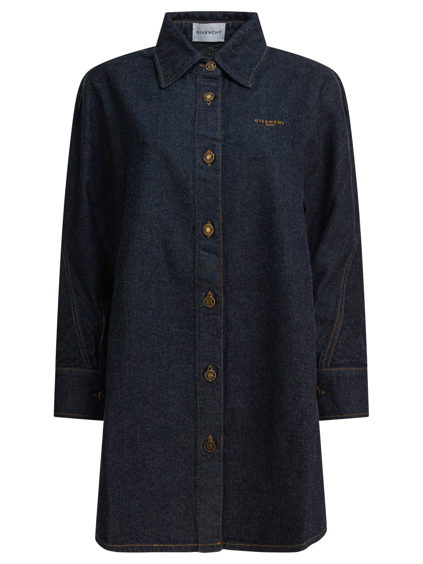 Givenchy's denim shirt represents a fusion of tradition and modernity, combining typical casual style with exclusive design details. Ideal for the contemporary woman, this garment features understated elegance and a strong visual identity, perfect for dynamic days that demand versatility and comfort. The distinctive GIVENCHY embroidery on the chest adds a special touch to a garment that proves timeless yet modern. || - GIVENCHY Paris logo embroidered on the chest - Classic collar - Long sleeves - GIVENCHY embossed leather application on the back - Button closure and button cuffs - GIVENCHY engraved buttons - Bias stitching for wrap-around volume - Relaxed fit