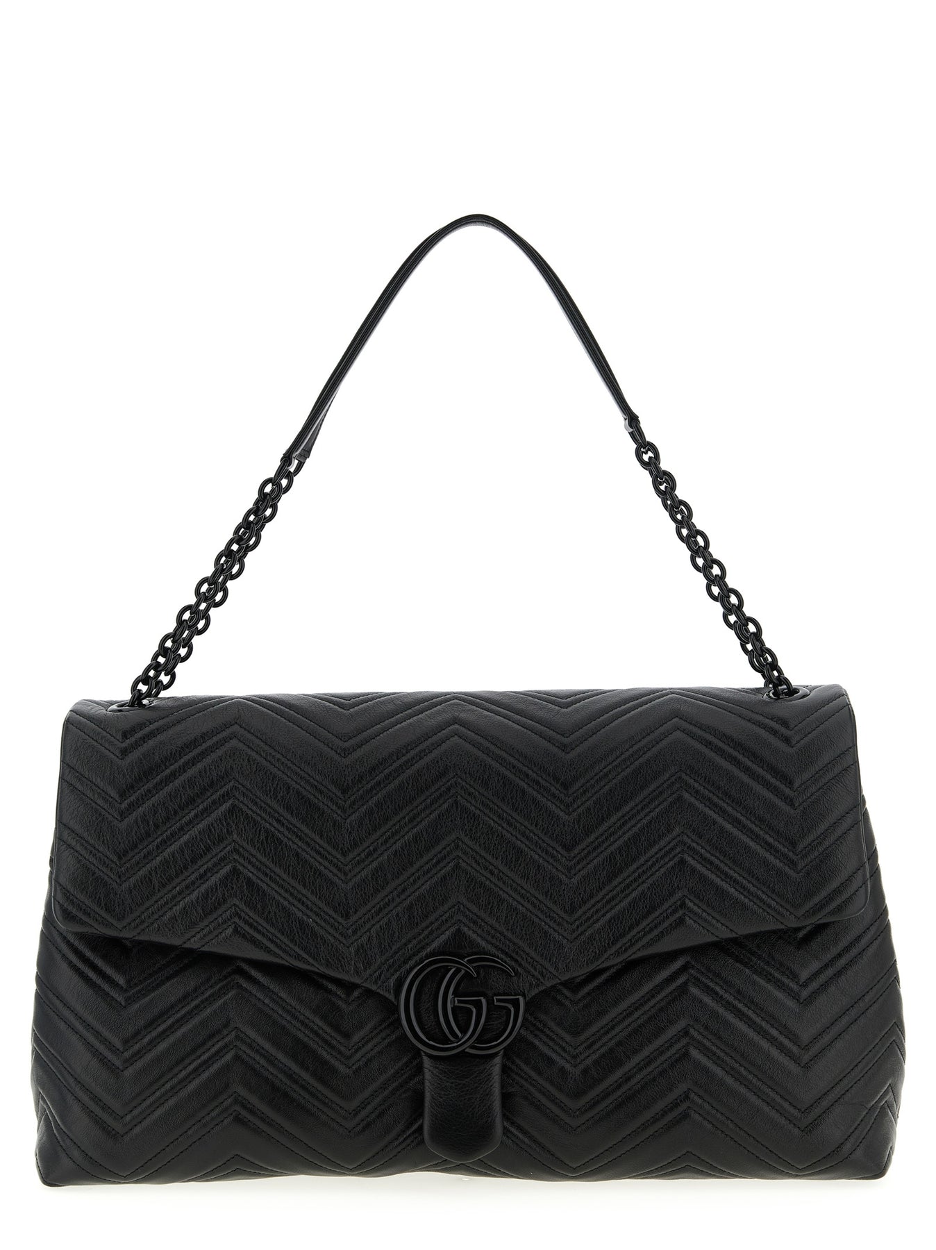 'GG Marmont' large shoulder bag in quilted matelassé leather with chevron pattern, sliding enameled chain shoulder strap with leather handles.